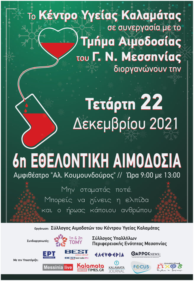 Το Κέντρο Υγείας Καλαμάτας σε συνεργασία με το Τμήμα Αιμοδοσίας του Γενικού Νοσοκομείου Καλαμάτας διοργανώνουν την 6η Εθελοντική Αιμοδοσία.