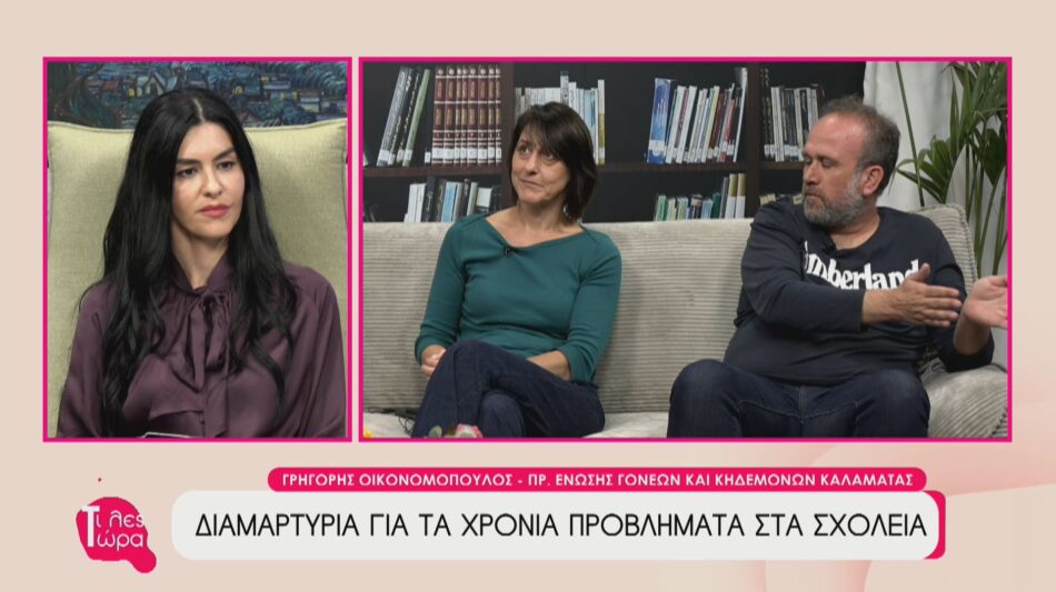 Ο Γρηγόρης Οικονομόπουλος ,πρόεδρος της Ένωσης Γονέων και Κηδεμόνων του Δήμου Καλαμάτας και η Χριστίνα Λαδά, πρόεδρος του Συλλόγου Εκπαιδευτικών Πρωτοβάθμιας Εκπαίδευσης Μεσσηνίας, καλεσμένοι στην εκπομπή ‘’Τι Λες Τώρα’’ με την Αναστασία Μάντζαρη, μίλησαν για τη νέα διαμαρτυρία γονέων και εκπαιδευτικών στον Δήμο Καλαμάτας, οι οποίοι ζητούν την άμεση επίλυση σοβαρών και χρόνιων προβλημάτων που αντιμετωπίζουν οι σχολικές μονάδες.