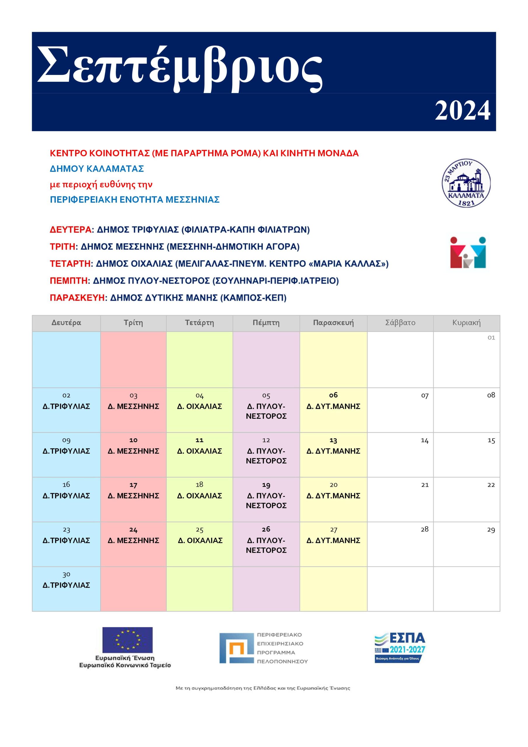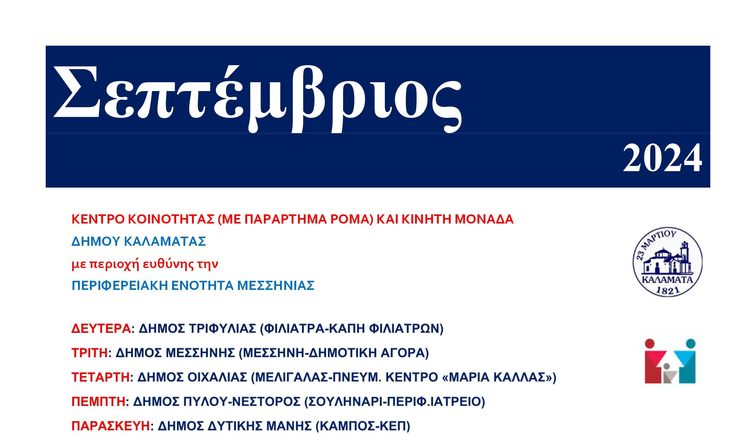 H κινητή μονάδα του Κέντρου Κοινότητας του Ν. Μεσσηνίας, θα βρίσκεται στο Δήμο Πύλου – Νέστορος και συγκεκριμένα στο δημοτικό κτήριο Σουληναρίου – Περιφερειακό Ιατρείο τις ακόλουθες ημερομηνίες 05, 12, 19 και 26 Σεπτεμβρίου 2024 και ώρες 9:30 – 13:00.