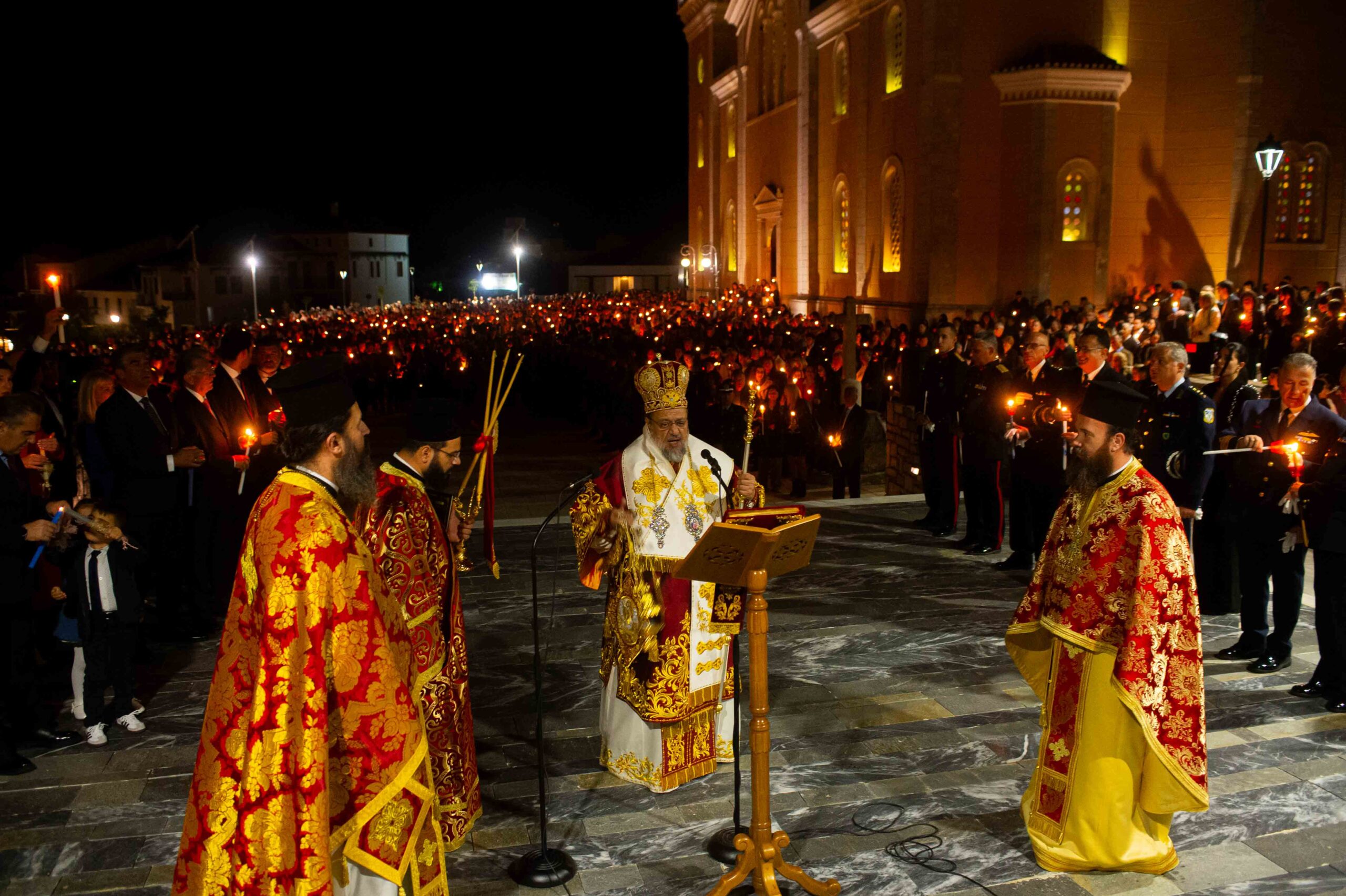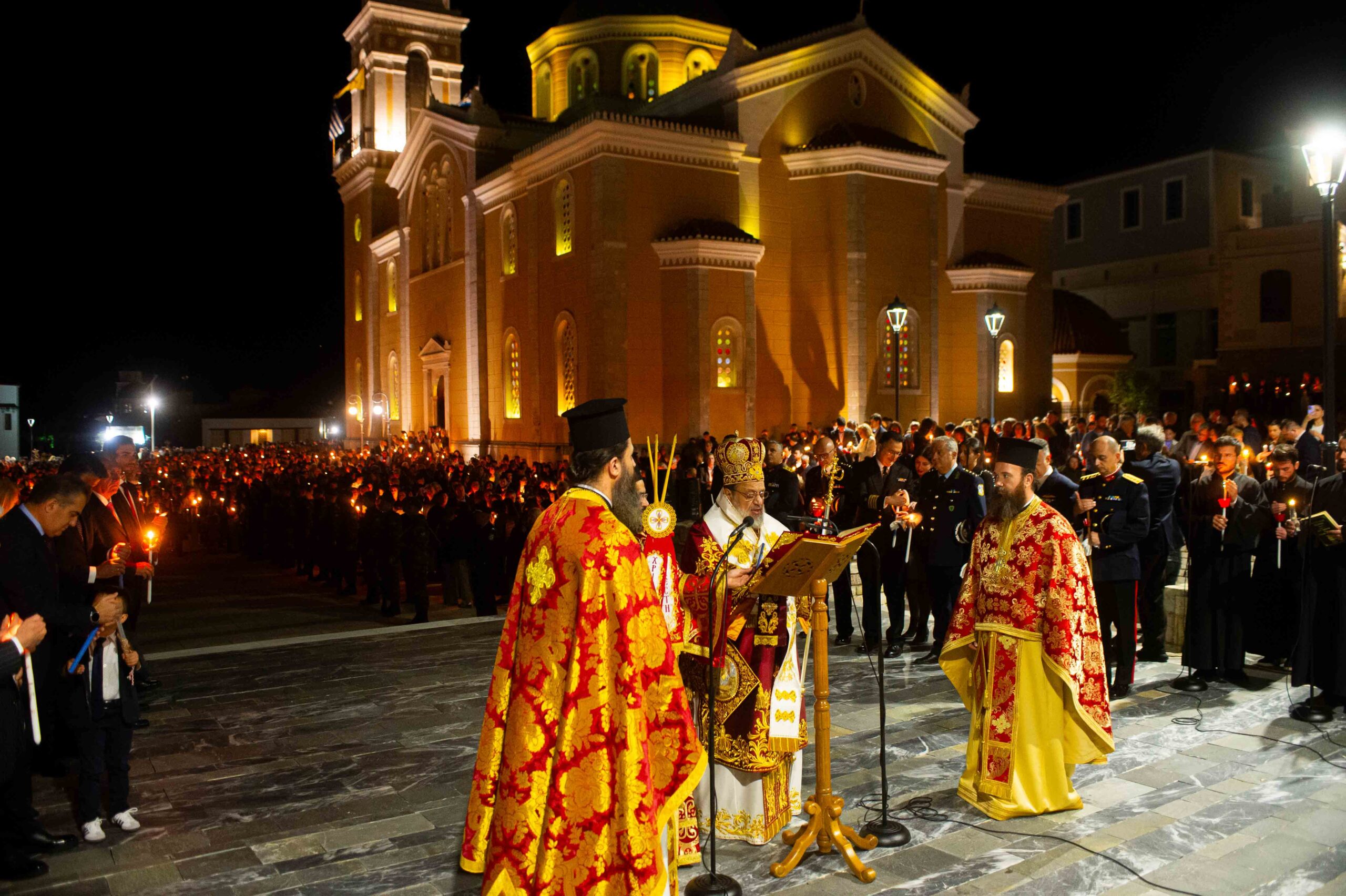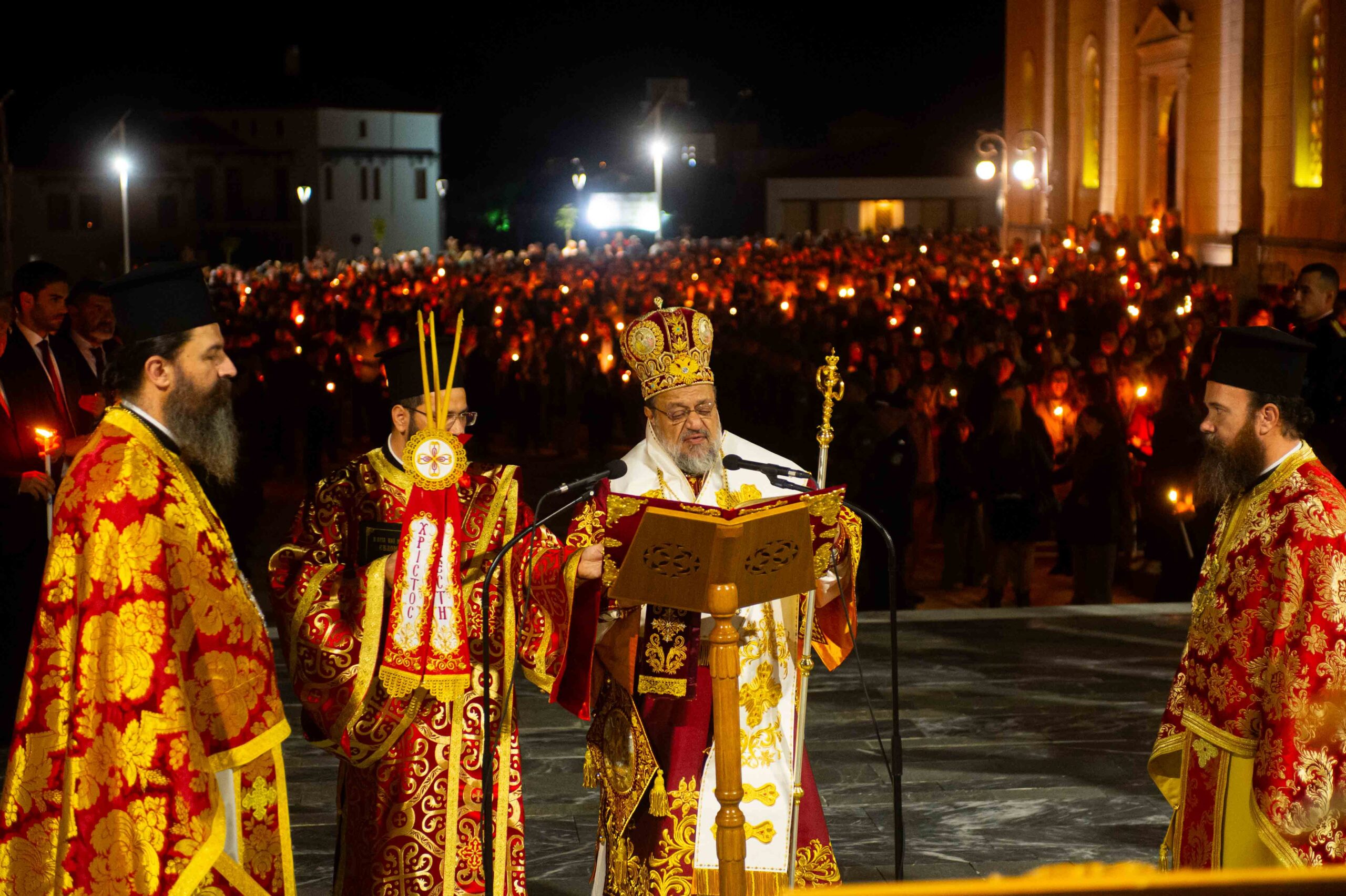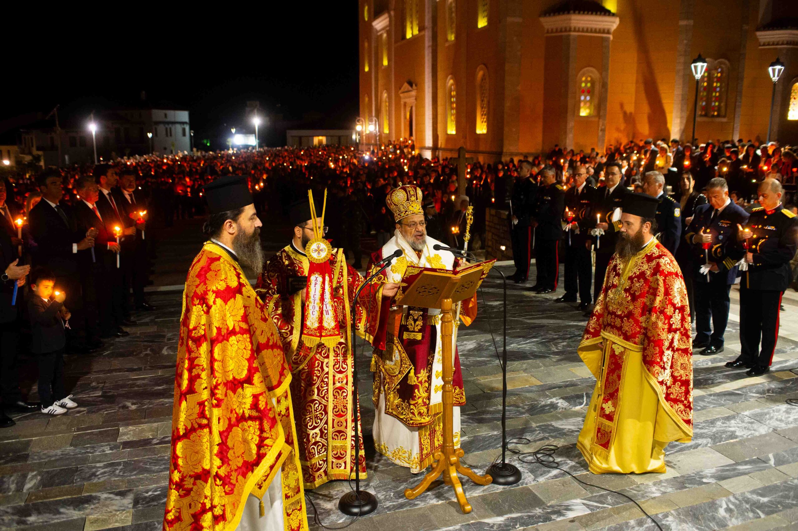 Αφού μετέδωσε το Άγιο Φως, προέστη της τελετής της Αναστάσεως στον αύλειο χώρο του Μητροπολιτικού Ναού, παρουσία εκπροσώπων Αρχών και Φορέων και πλήθους πιστών.
