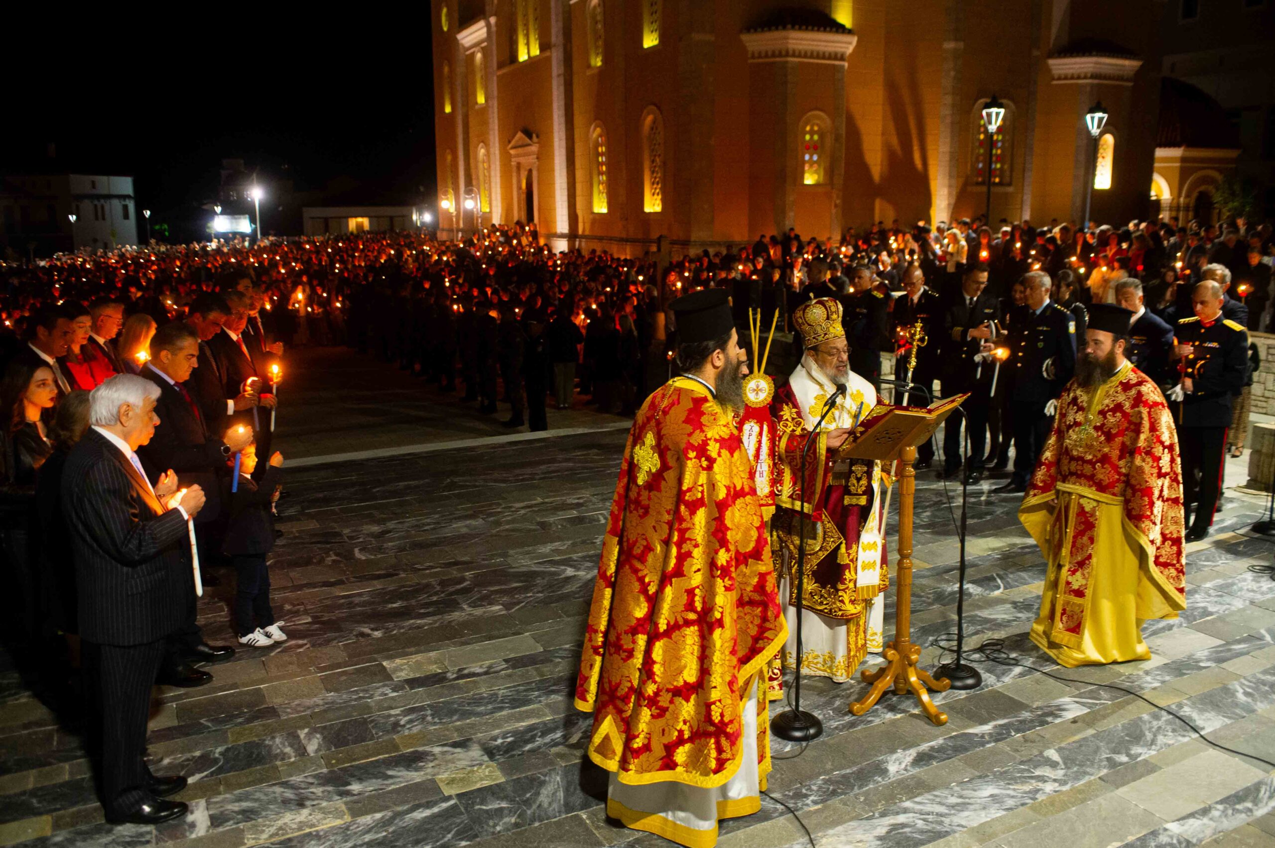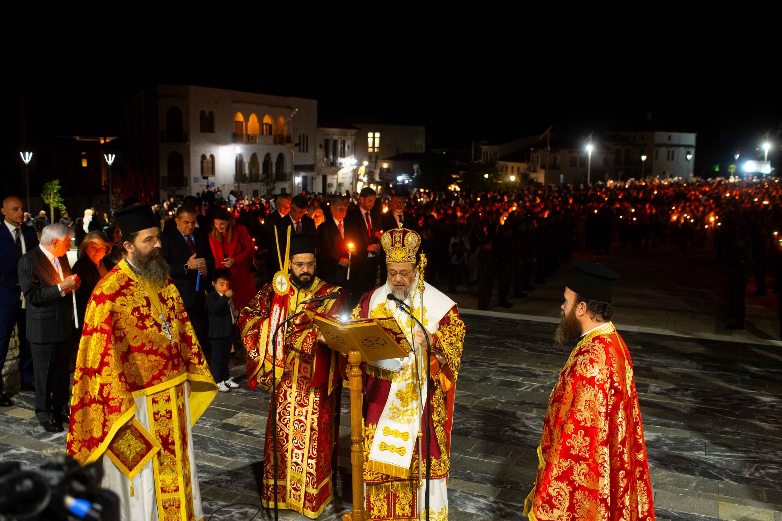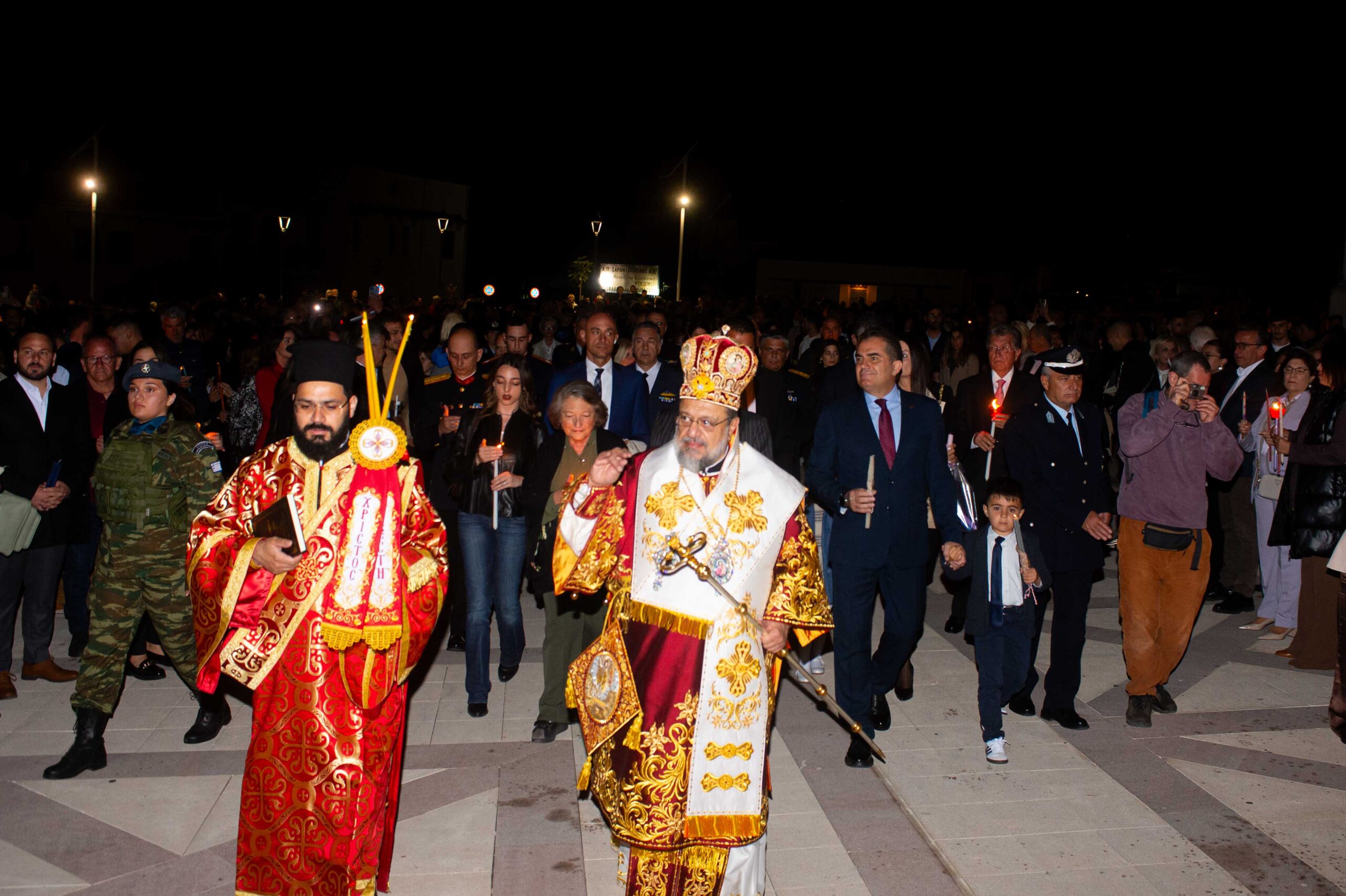Αφού μετέδωσε το Άγιο Φως, προέστη της τελετής της Αναστάσεως στον αύλειο χώρο του Μητροπολιτικού Ναού, παρουσία εκπροσώπων Αρχών και Φορέων και πλήθους πιστών.