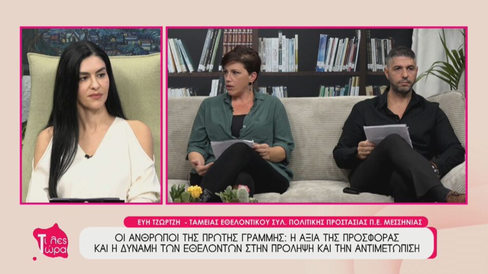 Ο πρόεδρος εθελοντικού συλλόγου πολιτικής προστασίας ΠΕ Μεσσηνίας Παναγιώτης Λεντζής και η ταμείας του  συλλόγου Εύη Τζώρτζη , βρέθηκαν καλεσμένοι στην εκπομπή ”Τι Λες Τώρα” με την Αναστασία Μάντζαρη, μιλώντας για την σπουδαιότητα του εθελοντισμού αλλά και τις δράσεις του συλλόγου.
