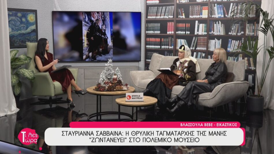 Στην εκπομπή «Τι Λες Τώρα» με την Αναστασία Μάντζαρη φιλοξενήθηκαν η ιστορικός Μαρία Λιακάκη, η αναβιώτρια Κική Γαλέα και η εικαστικός Βλασσούλα Βέβε, σε μια καθηλωτική συζήτηση για την επερχόμενη εκδήλωση τιμής στη Μανιάτισσα ηρωίδα Σταυριάννα Σάββαινα. Οι τρεις καλεσμένες φώτισαν άγνωστες πτυχές της ζωής της θρυλικής Ταγματάρχη, παρουσίασαν τη διαδικασία φιλοτέχνησης του πρώτου επίσημου πίνακά της και ανέλυσαν τη σημασία της ιστορικής αναβίωσης σήμερα. Η εκδήλωση, που αποτελεί καρπό συνεργασίας του Πολεμικού Μουσείου, του Συλλόγου «Αρχιστράτηγος Πέτρος Μαυρομιχάλης» και των Αναβιωτών Καλαμάτας και Μάνης, θα πραγματοποιηθεί το Σάββατο 27 Δεκεμβρίου στις 19:00 στο Πολεμικό Μουσείο Καλαμάτας. Πρόκειται για ένα μοναδικό οδοιπορικό στην ιστορία της Μάνης που υπόσχεται να συγκινήσει, αναδεικνύοντας το θάρρος της γυναίκας αγωνίστριας μέσα από την τέχνη και την επιστημονική έρευνα.