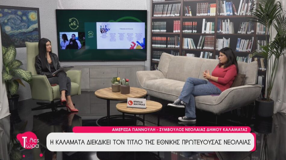 Η Αμέρισσα Γιαννούλη, Σύμβουλος Νεολαίας Δήμου Καλαμάτας, καλεσμένη στην εκπομπή ‘’Τι Λες Τώρα’’ με την Αναστασία Μάντζαρη, μίλησε για την πολύ σημαντική προσπάθεια που έχει ξεκινήσει η Καλαμάτα , διεκδικώντας τον τίτλο της Εθνικής Πρωτεύουσας Νεολαίας για το 2026.