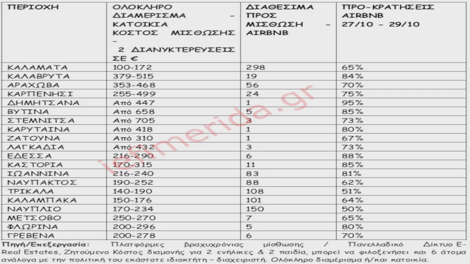Αν και τη φετινή χρονιά το τριήμερο είναι «κουτσουρεμένο», καθώς η 28η Οκτωβρίου πέφτει ημέρα Σάββατο, εντούτοις σε πολλούς προορισμούς καταγράφεται αύξηση των εγγεγραμμένων ακινήτων σε σχέση με το αντίστοιχο χρονικό διάστημα της περσινής χρονιάς. Συγκεκριμένα, αύξηση κατά 10% στην Αράχωβα, 28% στα Ιωάννινα, 25% στο Καρπενήσι, 10% στην Καλαμάτα και 39% στην Καστοριά.