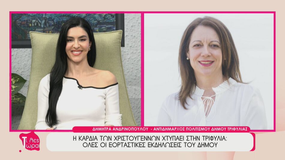 Η Αντιδήμαρχος Πολιτισμού δήμου Τριφυλίας, κυρία Δήμητρα Ανδρινοπούλου, ήταν καλεσμένη στην εκπομπή «Τι λες Τώρα» με την Αναστασία Μάντζαρη. Η κυρία Ανδρινοπούλου παρουσίασε το πλούσιο πρόγραμμα που απλώνεται σε όλες τις δημοτικές ενότητες, αναφέρθηκε στη σπουδαιότητα της συμμετοχής των τοπικών φορέων και κάλεσε τους δημότες και τους επισκέπτες να συμμετάσχουν στις δράσεις. Φωταγωγήσεις, θεατρικές παραστάσεις και συναυλίες συνθέτουν το γιορτινό σκηνικό του Δήμου μέχρι την Πρωτοχρονιά.
