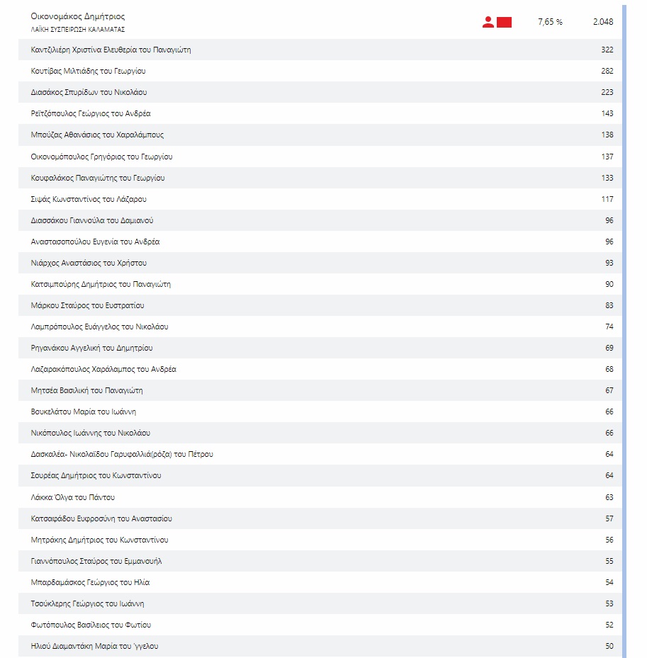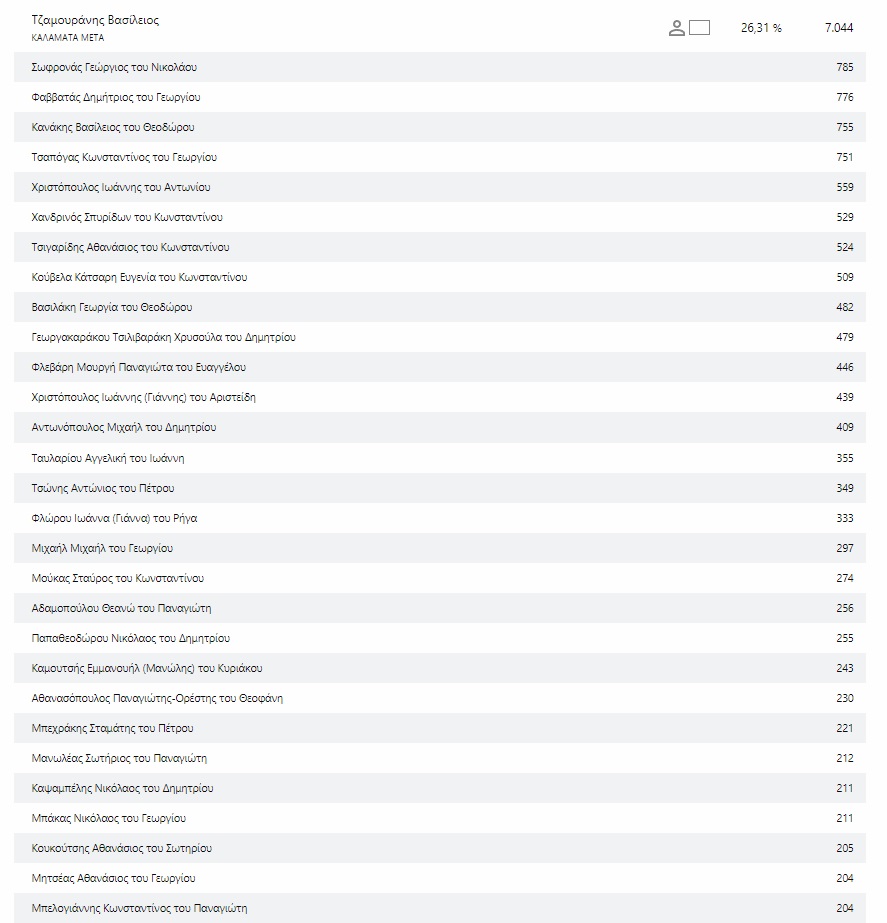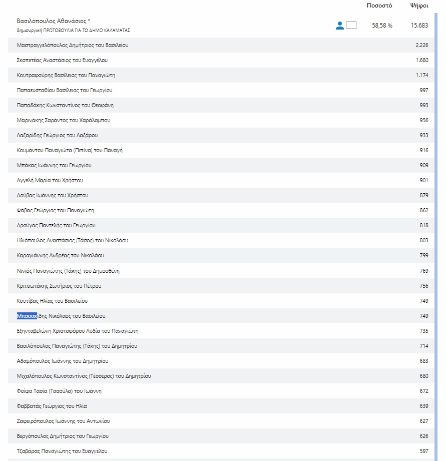 Η σαρωτική επικράτηση του Θανάση Βασιλόπουλου στον δήμο Καλαμάτας ήταν σίγουρα ένα από τα σημεία αναφοράς της αναμέτρησης των αυτοδιοικητικών εκλογών. Σκληρή όπως φαίνεται είναι η “μάχη” του σταυρού για το ποιοί θα βρεθούν στην θέση του δημοτικού συμβούλου για τα επόμενα 5 χρόνια. 21 εκπροσώπους θα έχει ο νυν και εκ νέου Δήμαρχος, 9 ο συνδυασμός του Β. Τζαμουράνη, 3 του Π. Χειλά και 2 του Δ. Οικονομάκου. Στους παραπάνω περιλαμβάνονται και οι σύμβουλοι των κοινοτήτων.