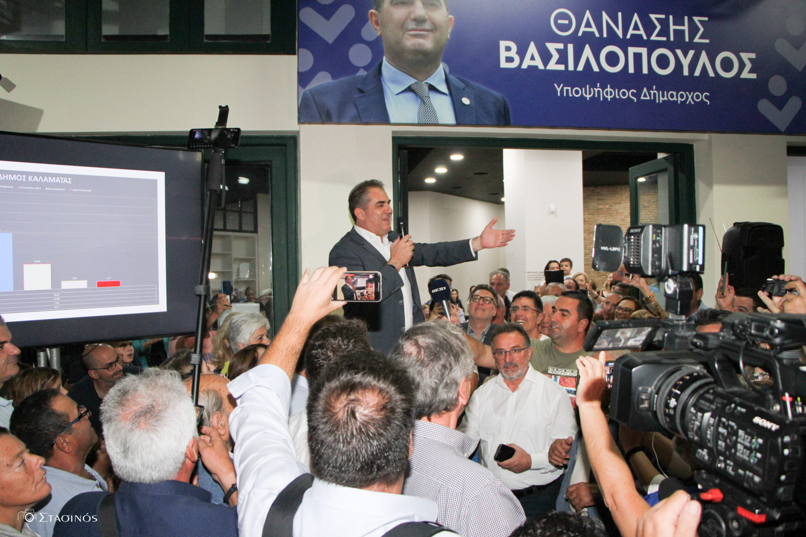 Ο επικεφαλής της «Δημιουργικής Πρωτοβουλίας για το Δήμο Καλαμάτας», Δήμαρχος Θανάσης Βασιλόπουλος, έφθασε στο εκλογικό του κέντρο, επί της πλατείας Σιδηροδρομικού Σταθμού, λίγα λεπτά μετά τις 23:00. Εκεί τον υποδέχθηκε με θέρμη και επευφημίες πλήθος υποστηρικτών του. Στο εκλογικό κέντρο, προκειμένου να συγχαρεί τον Δήμαρχο παραβρέθηκε ο πρώην Πρωθυπουργός Αντώνης Σαμαράς.