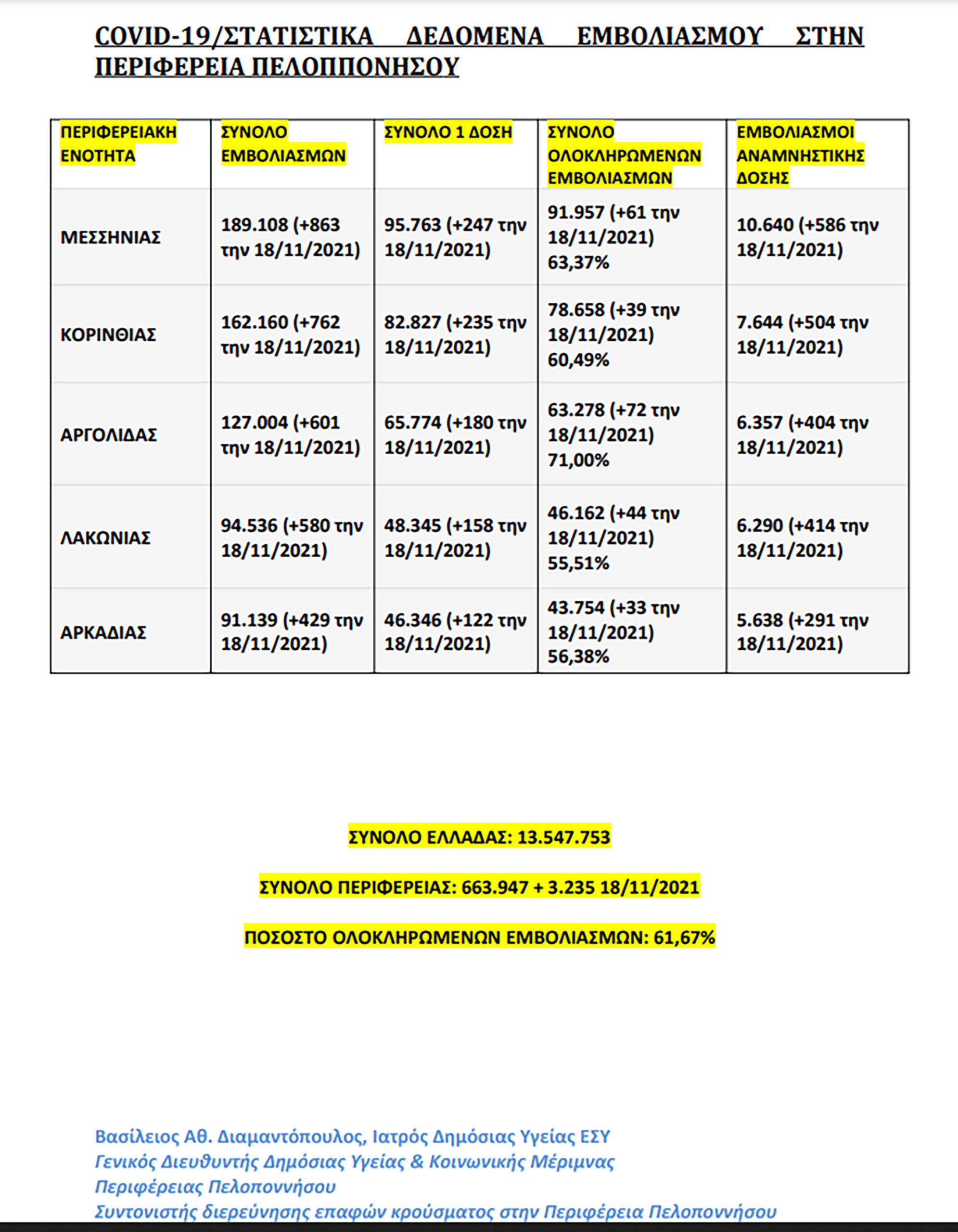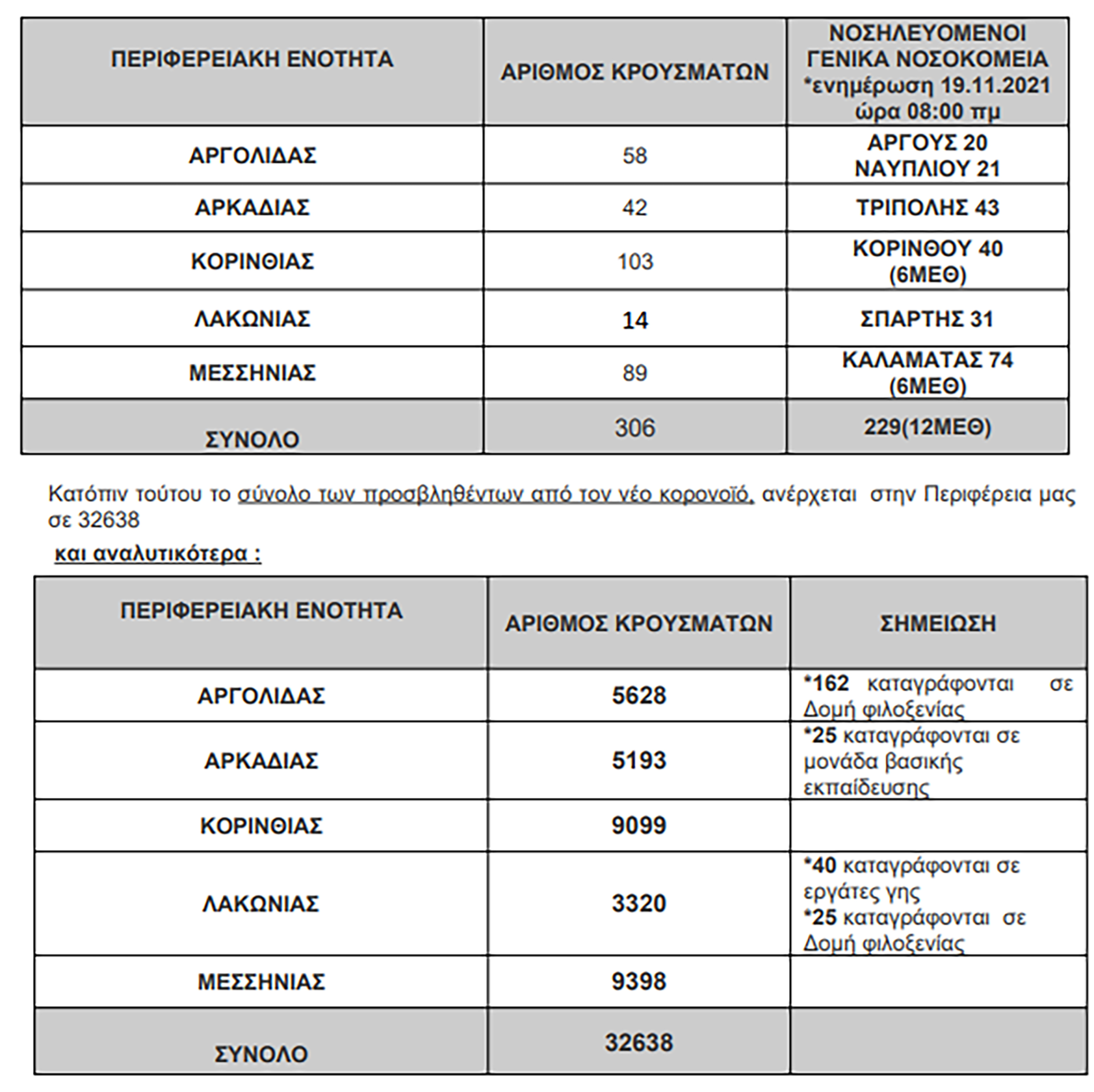 Αναλυτικά στοιχεία για τα κρούσματα και τους εμβολιασμούς στην Περιφέρεια Πελοποννήσου, μέχρι και χθες Πέμπτη 18 Νοεμβρίου, μπορείτε να δείτε εδώ: