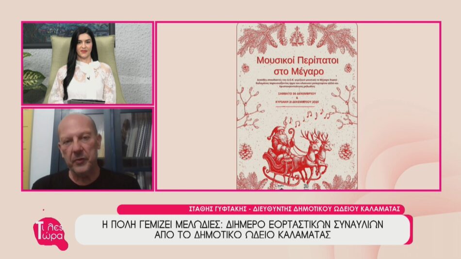 Στην εκπομπή «Τι Λες Τώρα» με την Αναστασία Μάντζαρη φιλοξενήθηκε ο Διευθυντής του Δημοτικού Ωδείου Καλαμάτας, Στάθης Γυφτάκης, σε μια συζήτηση γεμάτη μελωδίες και εορταστική διάθεση. Ο κύριος Γυφτάκης παρουσίασε το πλούσιο πρόγραμμα των συναυλιών που θα πραγματοποιηθούν το Σάββατο 20 και την Κυριακή 21 Δεκεμβρίου στο Black Box του Μεγάρου Χορού, όπου περισσότεροι από 130 σπουδαστές θα ξεδιπλώσουν το ταλέντο τους. Ο ίδιος τόνισε τη σημασία της μουσικής σύνδεσης των παιδιών με το κοινό αυτές τις άγιες ημέρες, προσκαλώντας όλη την πόλη σε μια γιορτή πολιτισμού με ελεύθερη είσοδο. Κλείνοντας, μοιράστηκε τις δικές του θερμές ευχές για μια νέα χρονιά γεμάτη δημιουργία και φως.