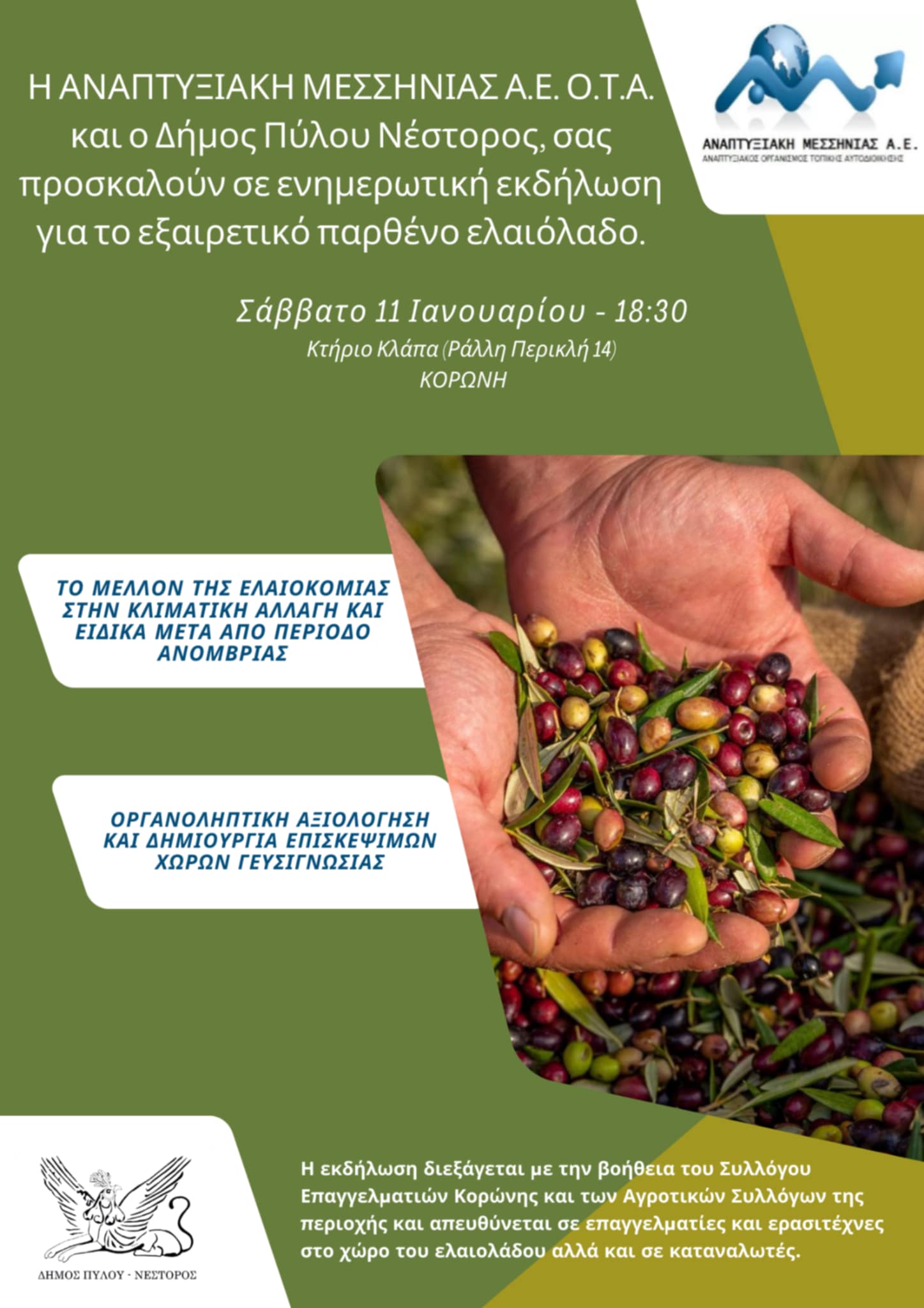 Η ΑΝΑΠΤΥΞΙΑΚΗ ΜΕΣΣΗΝΙΑΣ Α.Ε. Ο.Τ.Α. και ο Δήμος Πύλου – Νέστορος διοργανώνουν ενημερωτική ημερίδα στο επίκεντρο της οποίας θα βρεθεί το εξαιρετικό παρθένο ελαιόλαδο. Η ημερίδα πρόκειται να πραγματοποιηθεί το Σάββατο, 11 Ιανουαρίου, και ώρα 18:30, στο κτήριο Κλάπα (Ράλλη Περικλή 14) στην Κορώνη, όπου μια σειρά από θέματα πρόκειται να αναπτυχθούν που αφορούν τόσο στην καλλιέργεια όσο και στα προβλήματα που αντιμετωπίζουν οι παραγωγοί.
