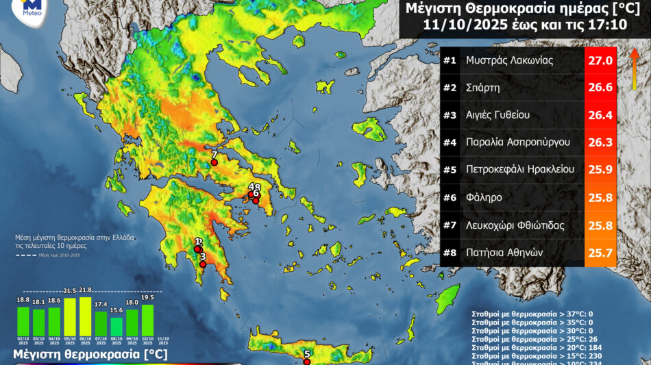 Υψηλές κατά τόπους θερμοκρασίες επικράτησαν στη χώρα το Σάββατο 11/10, με τις μέγιστες τιμές να φτάνουν στους 26-27°C. Σύμφωνα με το δίκτυο αυτόματων μετεωρολογικών σταθμών του Εθνικού Αστεροσκοπείου Αθηνών / meteo.gr, η υψηλότερη μέγιστη θερμοκρασία καταγράφηκε στην Μυστρά Λακωνίας με 27 °C.