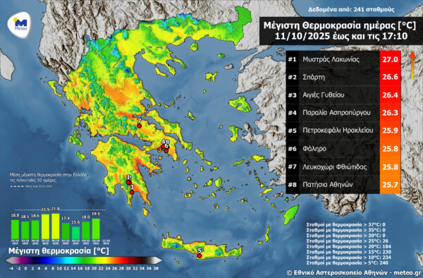Υψηλές κατά τόπους θερμοκρασίες επικράτησαν στη χώρα το Σάββατο 11/10, με τις μέγιστες τιμές να φτάνουν στους 26-27°C. Σύμφωνα με το δίκτυο αυτόματων μετεωρολογικών σταθμών του Εθνικού Αστεροσκοπείου Αθηνών / meteo.gr, η υψηλότερη μέγιστη θερμοκρασία καταγράφηκε στην Μυστρά Λακωνίας με 27 °C.