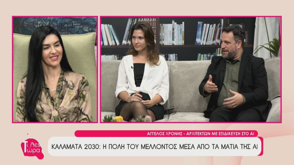 Ελευθερία Παπαδόσιφου, Αρχιτέκτονας , καλεσμένοι στην εκπομπή ”Τι Λες Τ’ωρα΄΄ με την Αναστασία Μάντζαρη, μίλησαν για την πλατφόρμα ψηφιακού δίδυμου της πόλης, που παρουσίασαν στην εκδήλωση ”Καλαμάτα 2030” , στην οποία έχουν καταχωρηθεί όλα τα δεδομένα του κλιματικού συμβολαίου και θα μπορεί το κοινό μέσω ενός ψηφιακού βοηθού να συνομιλεί και να αντλεί στοιχεία για την κλιματική ουδετερότητα.
