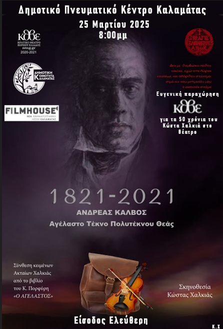 Με ελεύθερη είσοδο θα προβληθεί η κινηματογραφημένη παράσταση «Ανδρέας Κάλβος – Αγέλαστο Τέκνο Πολυτέκνου Θεάς», σε σκηνοθεσία του Κώστα Χαλκιά, (για τα 200 χρόνια της Εθνικής Επανάστασης 1821 – 2021), την Τρίτη 25 Μαρτίου, και ώρα 8 μ.μ. στο δημοτικό πνευματικό κέντρο Καλαμάτας.