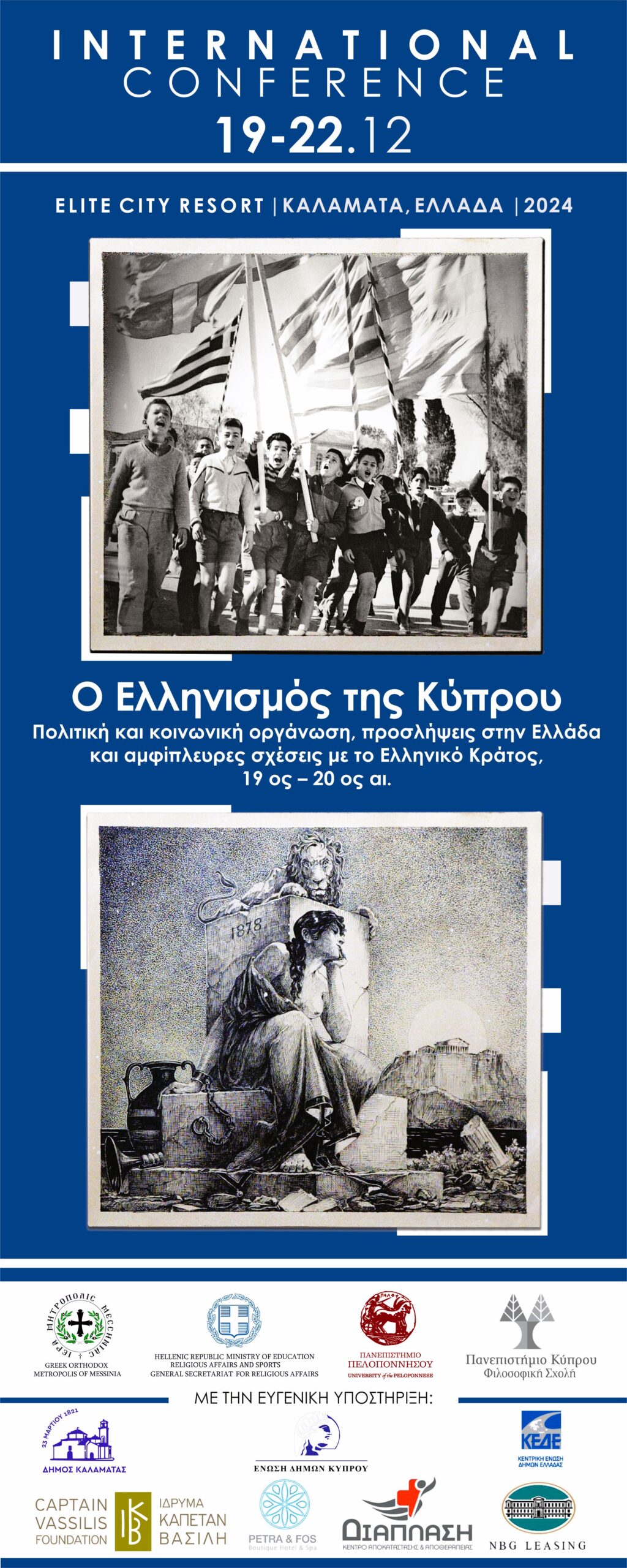 Ξεκινά σήμερα το Διεθνές Συνέδριο, με αφορμή την συμπλήρωση πενήντα ετών από την τουρκική εισβολή στην Κύπρο, με τίτλο : “Ο Ελληνισμός της Κύπρου : πολιτική και κοινωνική οργάνωση, προσλήψεις στην Ελλάδα και αμφίπλευρες σχέσεις με το Ελληνικό Κράτος, 19ος – 20ος αι. “, που διοργανώνουν η Ιερά Μητρόπολη Μεσσηνίας και η Γενική Γραμματεία Θρησκευμάτων του Υπουργείου Παιδείας και Θρησκευμάτων της Ελλάδος, σε συνεργασία με την ΚΕΔΕ, την Ένωση Δήμων Κύπρου, την Φιλοσοφική Σχολή Πανεπιστημίου Κύπρου και το Πανεπιστήμιο Πελοποννήσου, μέχρι τις 21 Δεκεμβρίου 2024.