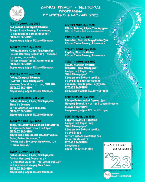 – Τετάρτη 23 Αυγούστου στις 9.30 μ.μ. στο Δημοτικό Σχολείο Χαρακοπιού: παράσταση “Ατρείδες – η επιστροφή” σε σκηνοθεσία Γιάννη Μαργαρίτη από το ΔΗΠΕΘΕ Καλαμάτας και είσοδο ελεύθερη (οργάνωση: Δήμος Πύλου – Νέστορος).