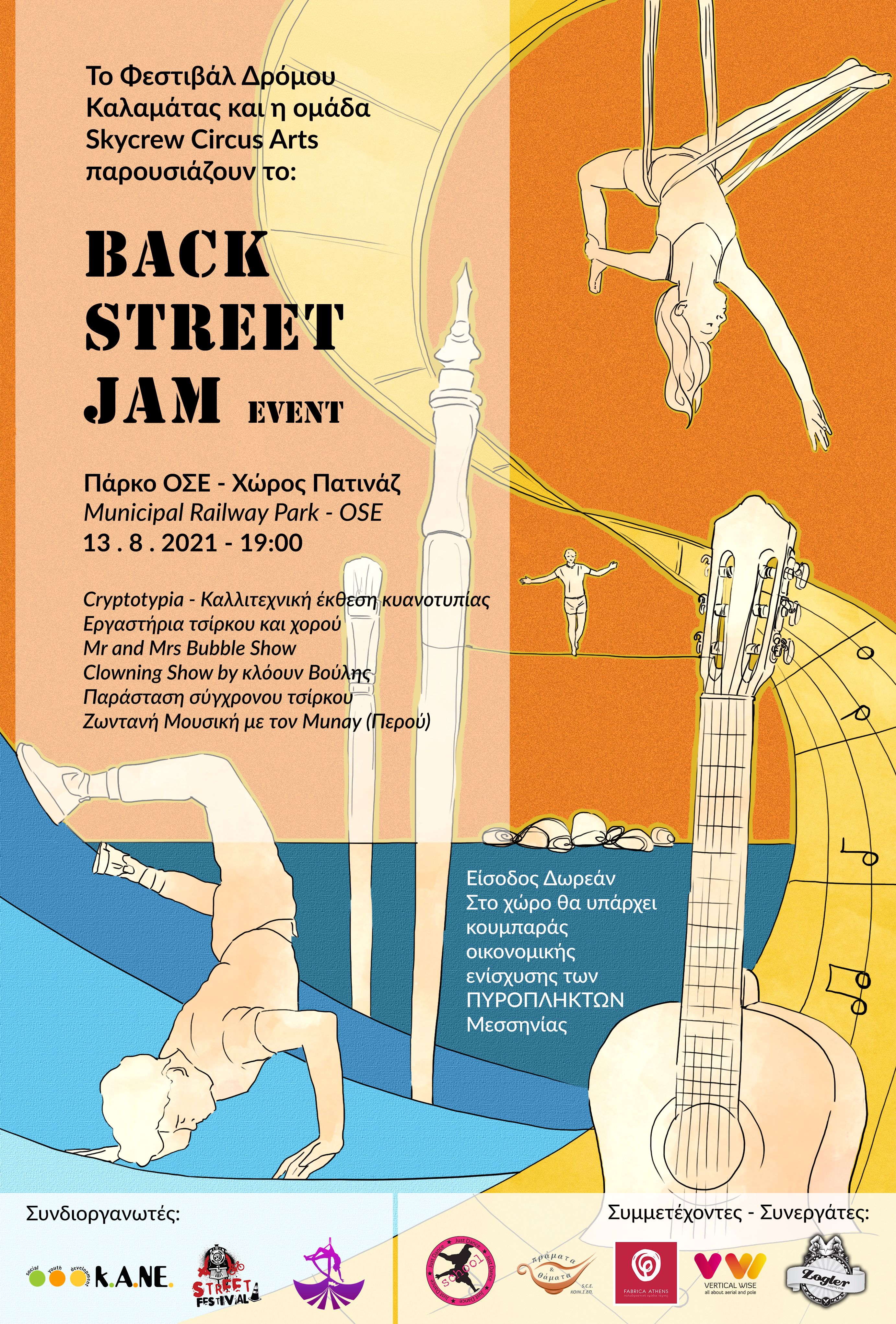 Στις 7 μ.μ .σήμερα το απόγευμα στο χώρο του πατινάζ στο Πάρκο Σιδηροδρόμων θα διοργανωθεί το Back Street Jam. Πρόκειται για μια καλλιτεχνική εκδήλωση βασισμένη στις τέχνες του δρόμου, που σκοπό έχει να συγκεντρώσει χρήματα ώστε να καλυφθούν ανάγκες ανθρώπων που έχουν πληγεί από τις πρόσφατες καταστροφικές πυρκαγιές του νομού Μεσσηνίας. Σε εκδήλωση αυτή συμμετέχουν ομάδες και καλλιτέχνες από την Καλαμάτα, την Αθήνα και το εξωτερικό. Πιο συγκεκριμένα την εκδήλωση συνδιοργανώνουν το Φεστιβάλ Δρόμου Καλαμάτας και η Skycrew Circus Arts, ενώ συμμετέχουν οι Just Dance School, Fabrica Athens, Πράματα και Θάματα ΚΟΙΝΣΕΠ, ο Κλόουν Βούλης και ο οργανισμός νεολαίας και εκπαίδευσης Κ.Α.ΝΕ.. Η εκδήλωση θα περιλαμβάνει δραστηριότητες για παιδιά και ενήλικες και η είσοδος θα είναι δωρεάν.