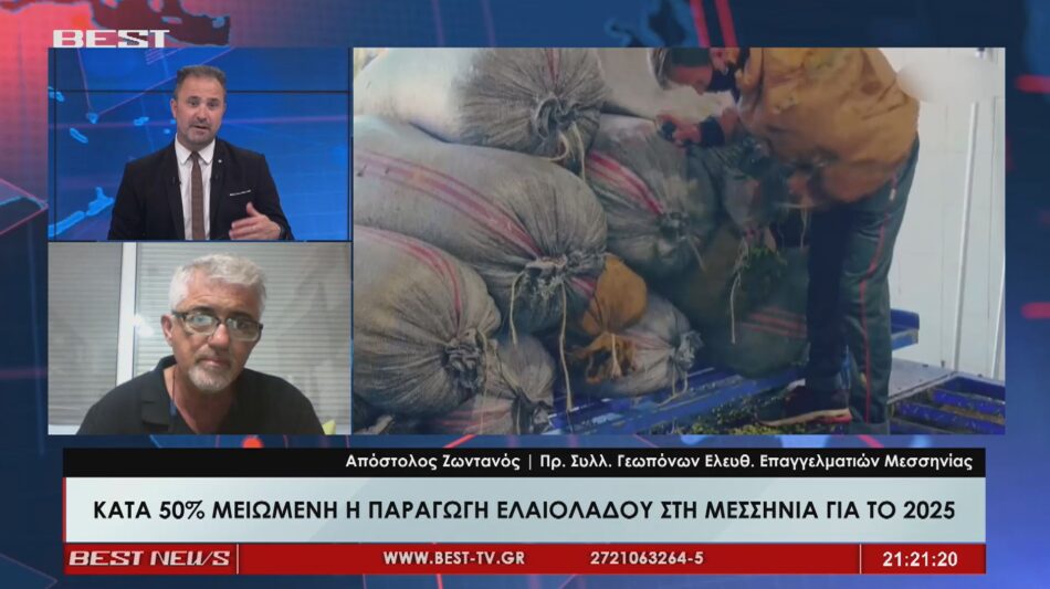 Μείωση της παραγωγής κατά περίπου 50% σε σχέση με πέρυσι εκτιμούν οι γεωπόνοι της Μεσσηνίας, αποδίδοντας το φαινόμενο κυρίως στις επιπτώσεις της κλιματικής αλλαγής. Αν και το αποτέλεσμα αυτό δεν προκαλεί έκπληξη, καθώς, όπως επισημαίνει ο Απόστολος Ζωντανός, πρόεδρος του Συλλόγου Γεωπόνων Ελευθέρων Επαγγελματιών Μεσσηνίας, οι καιρικές συνθήκες είχαν λίγο-πολύ προϊδεάσει για την κατάσταση, εντύπωση προκαλεί το γεγονός ότι «κάποιοι προσπαθούσαν να ανεβάσουν την εκτίμηση της παραγωγής στους 350 χιλιάδες τόνους, όπως και την παγκόσμια παραγωγή στα 4 εκατομμύρια». Φέτος, σημείωσε ο κ. Ζωντανός μιλώντας στο κεντρικό δελτίο ειδήσεων του Best, «θα είναι ζήτημα εάν η παγκόσμια παραγωγή φτάσει τα 3 εκατομμύρια τόνους», υπογραμμίζοντας έτσι το μέγεθος του προβλήματος.