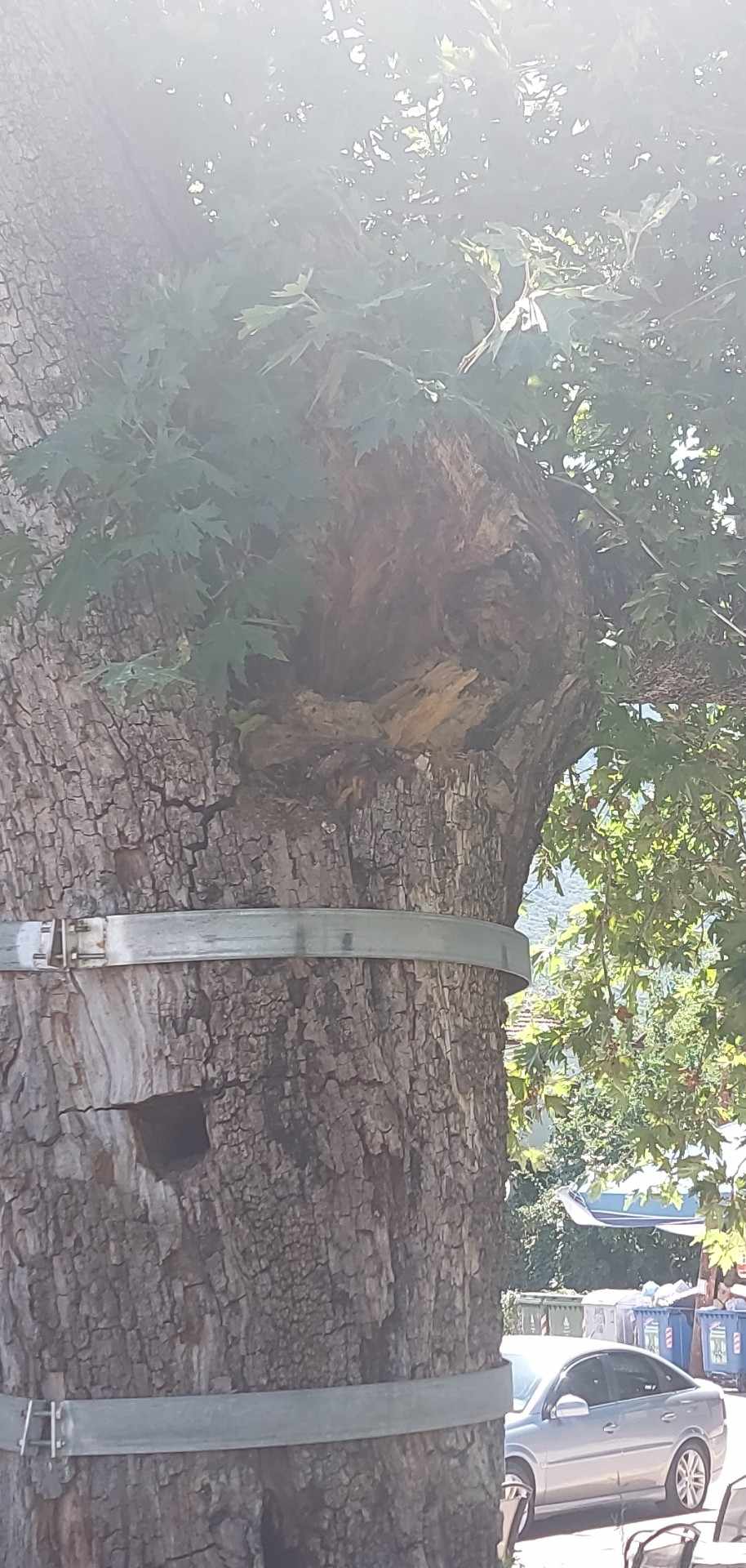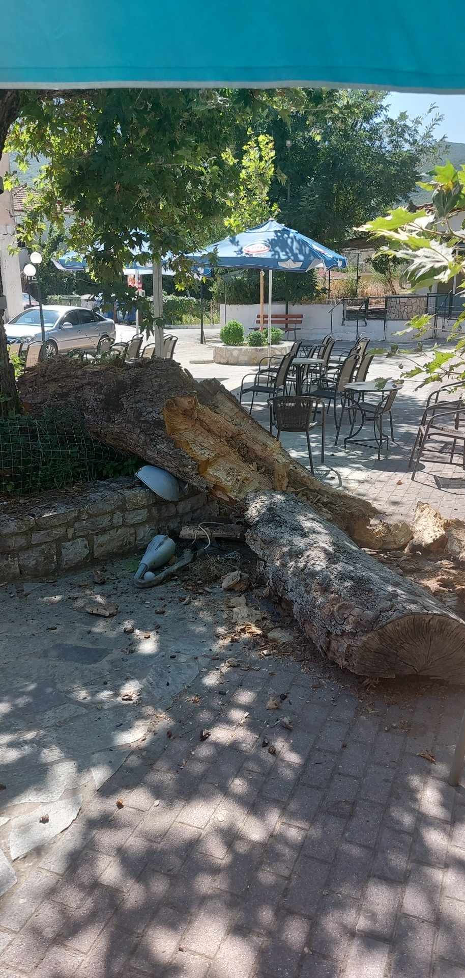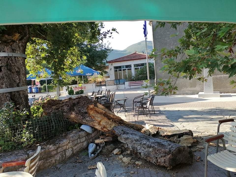 Μέχρι που χθες αργά το βράδυ ευτυχώς γιατί εκείνη των ώρα δεν υπήρχε κανείς στην πλατεία, μεγάλο μέρος του δέντρου κατέρρευσε.