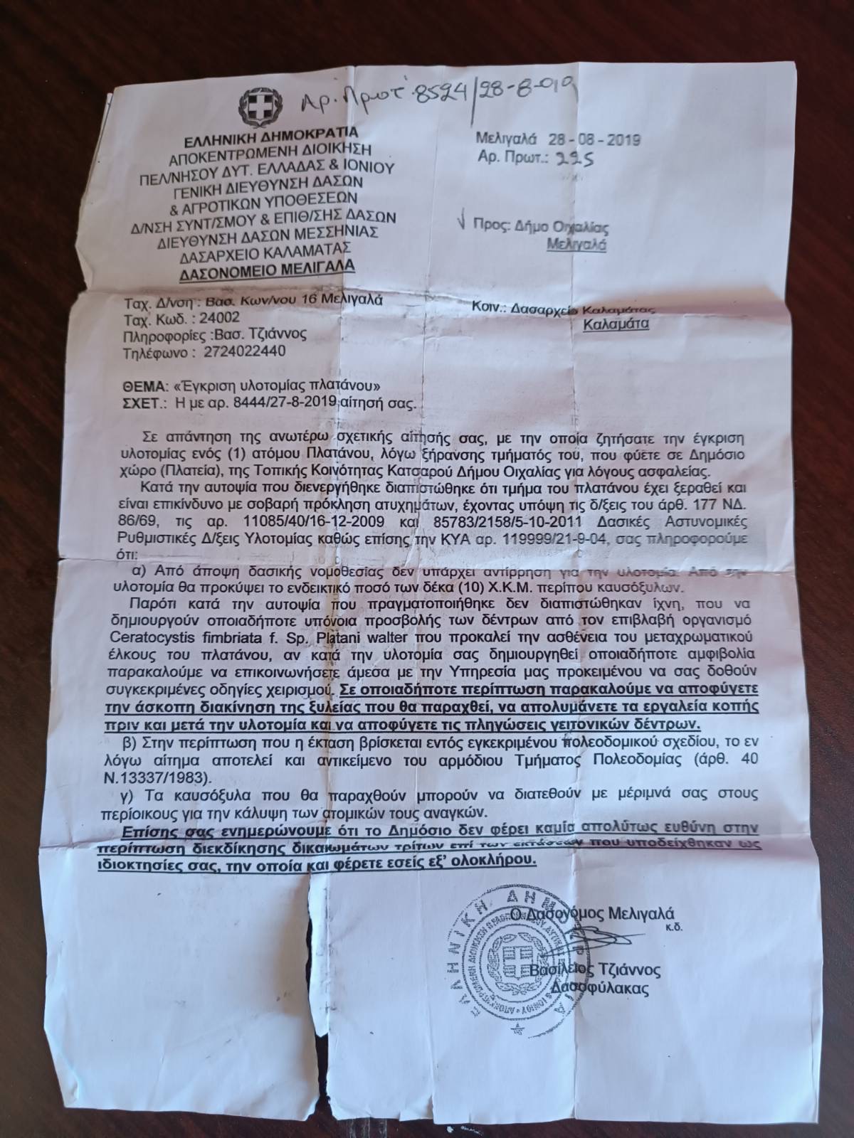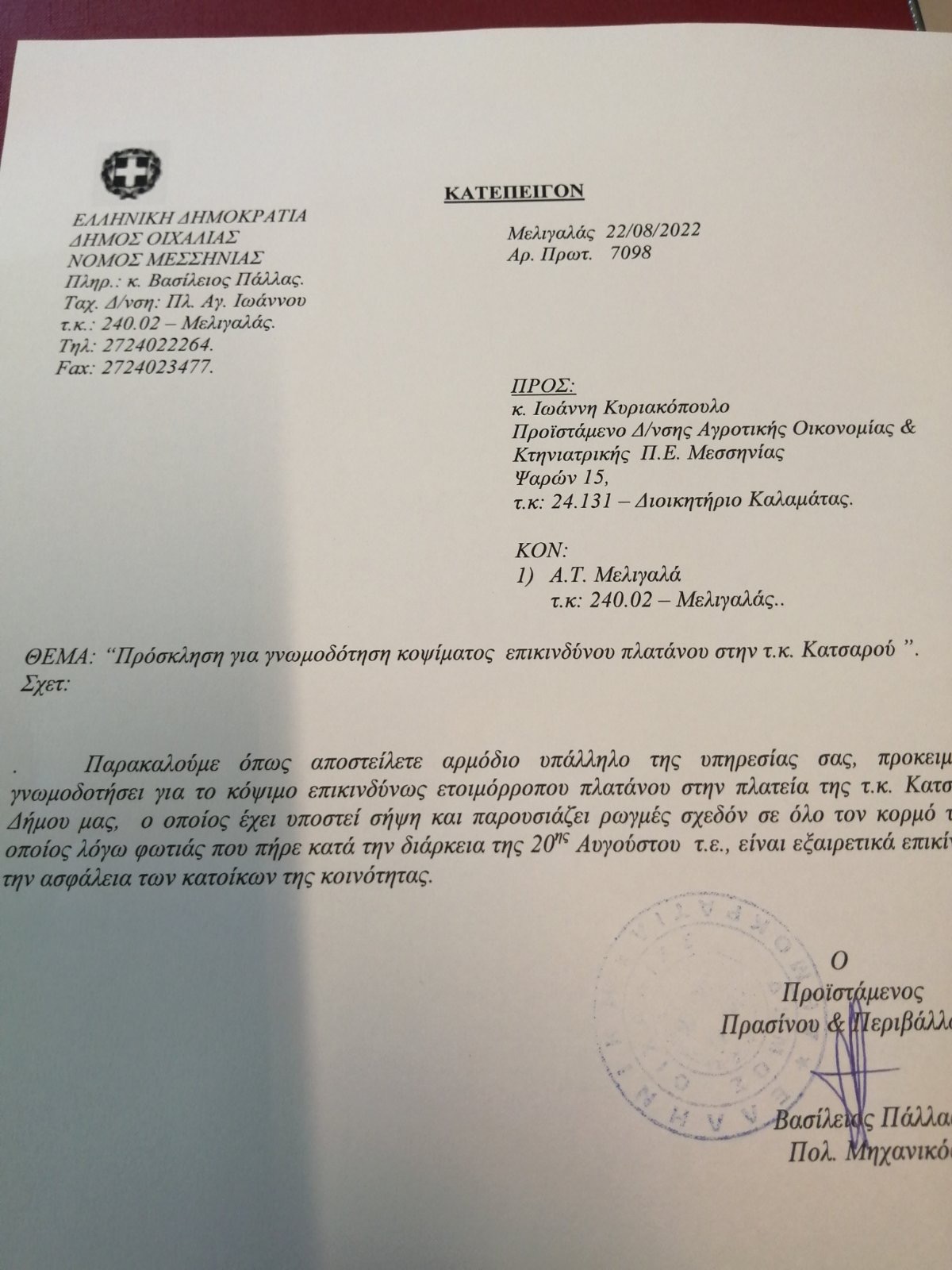 Ανακοίνωσε εξέδωσε και ο συνδυασμός “Αναγέννηση Άνω Μεσσηνίας” κρούοντας κώδωνα για τους κινδύνους που ελλοχεύουν από την παραμονή του πλάτανου στο σημείο.