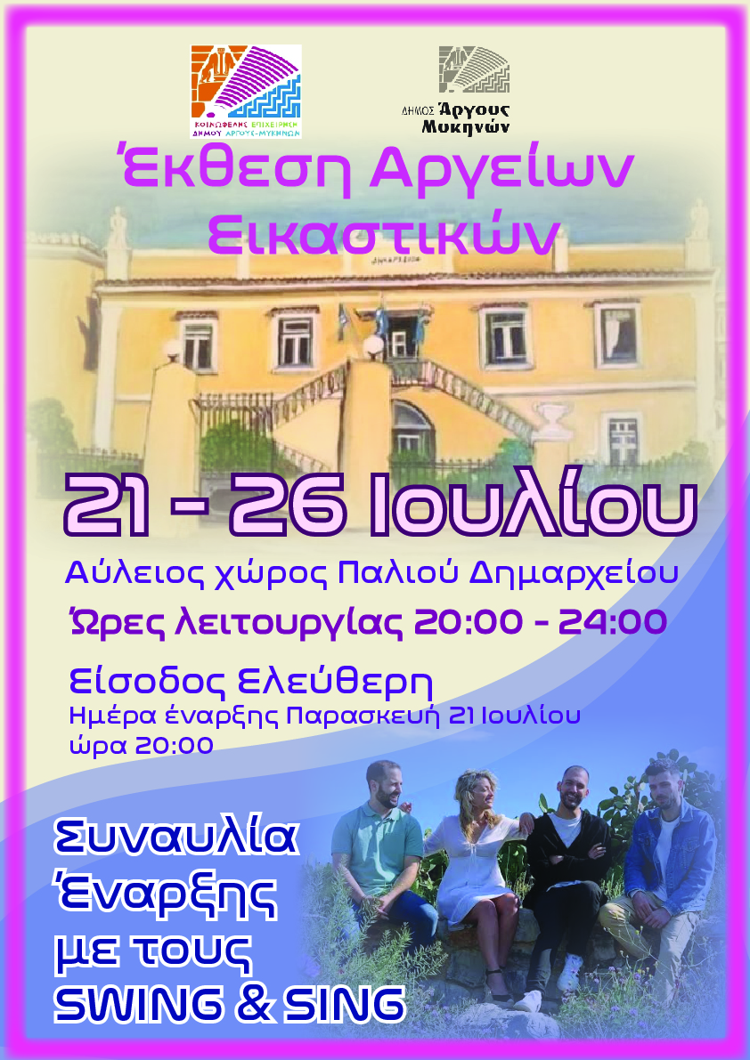 «Ομαδική Έκθεση Αργείων Εικαστικών» διοργανώνει η ΚΕΔΑΜ από 21 έως 26 Ιουλίου 2023, στον αύλειο χώρο του παλαιού Δημαρχείου στο Άργος.