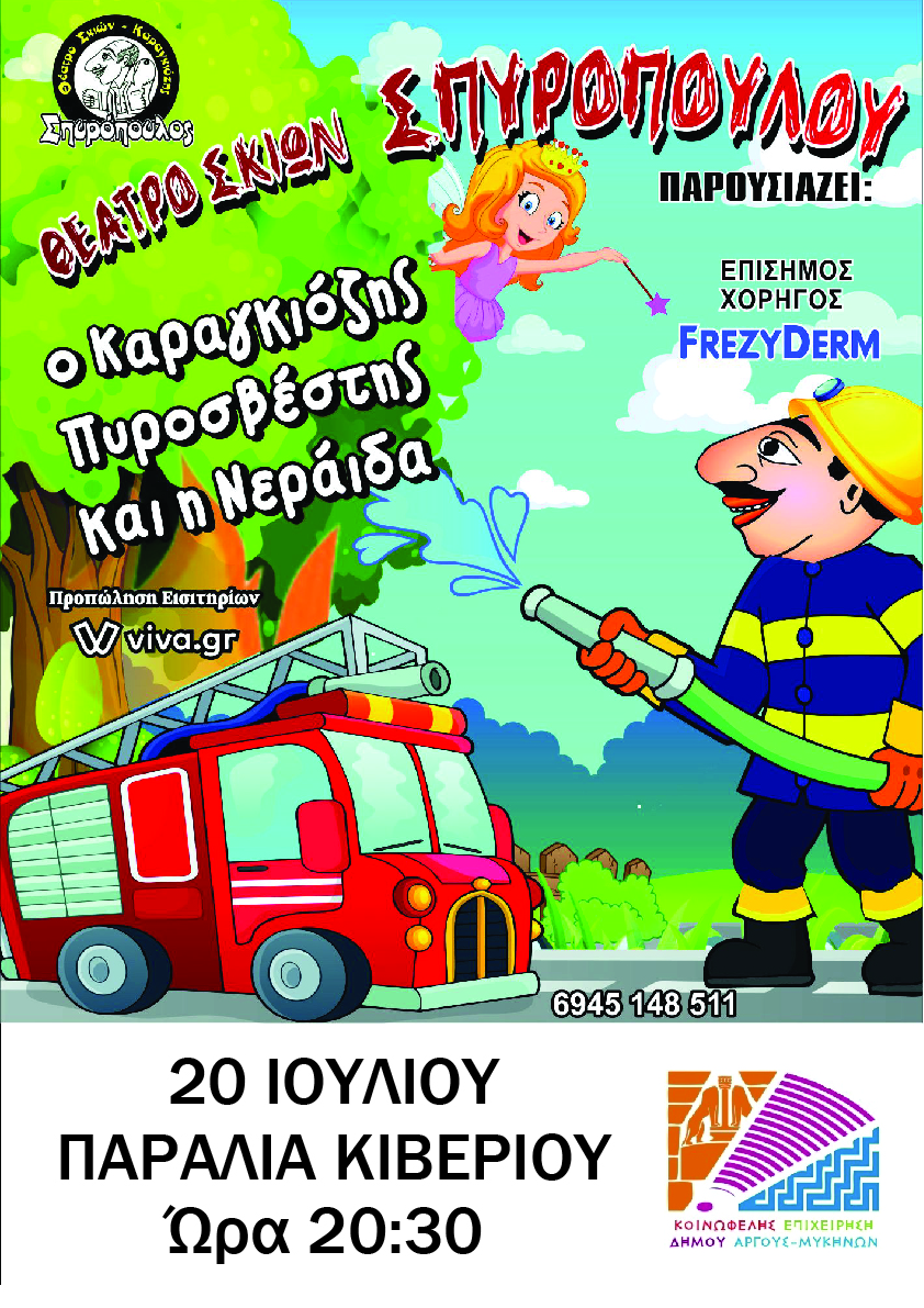 Την Πέμπτη 20 Ιουλίου και ώρα 8.30 το βράδυ στην παραλία Κιβερίου, η ΚΕΔΑΜ οργανώνει παιδική βραδιά με το Θέατρο Σκιών Σπυρόπουλου που παρουσιάζει τον «Καραγκιόζη Πυροσβέστη και τη Νεράϊδα».