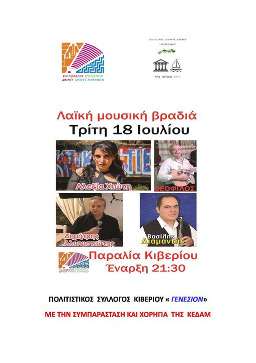 Την Τρίτη 18 Ιουλίου 2023 και ώρα 9.30 το βράδυ στην παραλία Κιβερίου, ο πολιτιστικός σύλλογος Γεννέσιον με την υποστήριξη και τη χορηγία της ΚΕΔΑΜ διοργανώνει «Λαϊκή Μουσική βραδιά» με τους: Αλεξία Χιώτη, Θεόφιλο, Δημήτρη Αλωνιστιώτη και Βασίλη Διαμαντή.