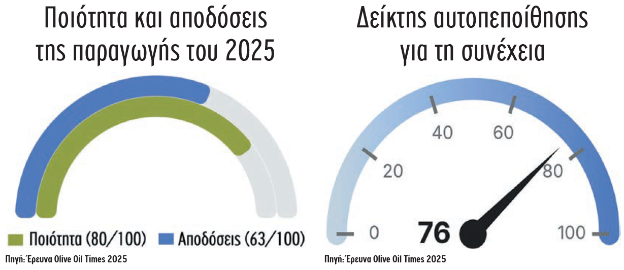 Η έλλειψη εργατικών χεριών παρέμεινε από τις κύριες ανησυχίες των καλλιεργητών, για το 41% των ερωτηθέντων, ενώ αρκετοί ανέφεραν και άλλα ζητήματα, όπως το αυξημένο κόστος άλεσης, τα κόστη συσκευασίας και το κόστος του ρεύματος. Ιδιαίτερα για τους ελαιοκαλλιεργητές της Νότιας Ευρώπης το αυξημένο εργατικό κόστος επισημάνθηκε από τους παραγωγούς, κάτι που καταγράφεται και από τη Eurostat, παρατηρεί η έρευνα. Πάντως, παρά τις σημαντικές αντιξοότητες που παραμένουν, οι ελαιοκαλλιεργητές φαίνεται πως επιμένουν να διατηρήσουν τους ελαιώνες τους, άλλοτε επικαλούμενοι το πάθος τους γι’ αυτούς και επενδύοντας σε αγροτουρισμό και απευθείας πωλήσεις κι άλλοτε βρίσκοντας στήριγμα σε νέες τεχνολογίες και εκσυγχρονισμό, μέσω βελτιωμένων πρακτικών άρδευσης, στρατηγικών διαχείρισης της υγείας των δέντρων και νέων τεχνολογιών ελαιοποίησης. Οι παραγωγοί αξιολόγησαν την εμπιστοσύνη τους στο μέλλον της επιχείρησής τους στο 76, στην εκατοστιαία κλίμακα, αντικατοπτρίζοντας μια ανθεκτική προοπτική που στηρίζεται στην καινοτομία, την προσαρμογή και τη συνεχή επένδυση στην ποιότητα, επισημαίνει η έρευνα.