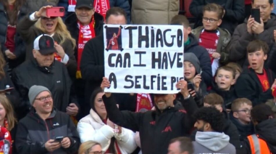 Την ώρα που ο αγώνας ήταν σε εξέλιξη, ο σπουδαίος Γερμανός τεχνικός, αποφάσισε να… τρολάρει τον άλλοτε παίκτη του στους «κόκκινους», Τιάγκο Αλκάνταρα. Συγκεκριμένα, ανέβηκε στην κερκίδα και ανάμεσα στον κόσμο σήκωσε ένα χαρτόνι. Το εν λόγω χαρτόνι έγραφε χαρακτηριστικά: «Τιάγκο, μπορώ να έχω μια selfie παρακαλώ».