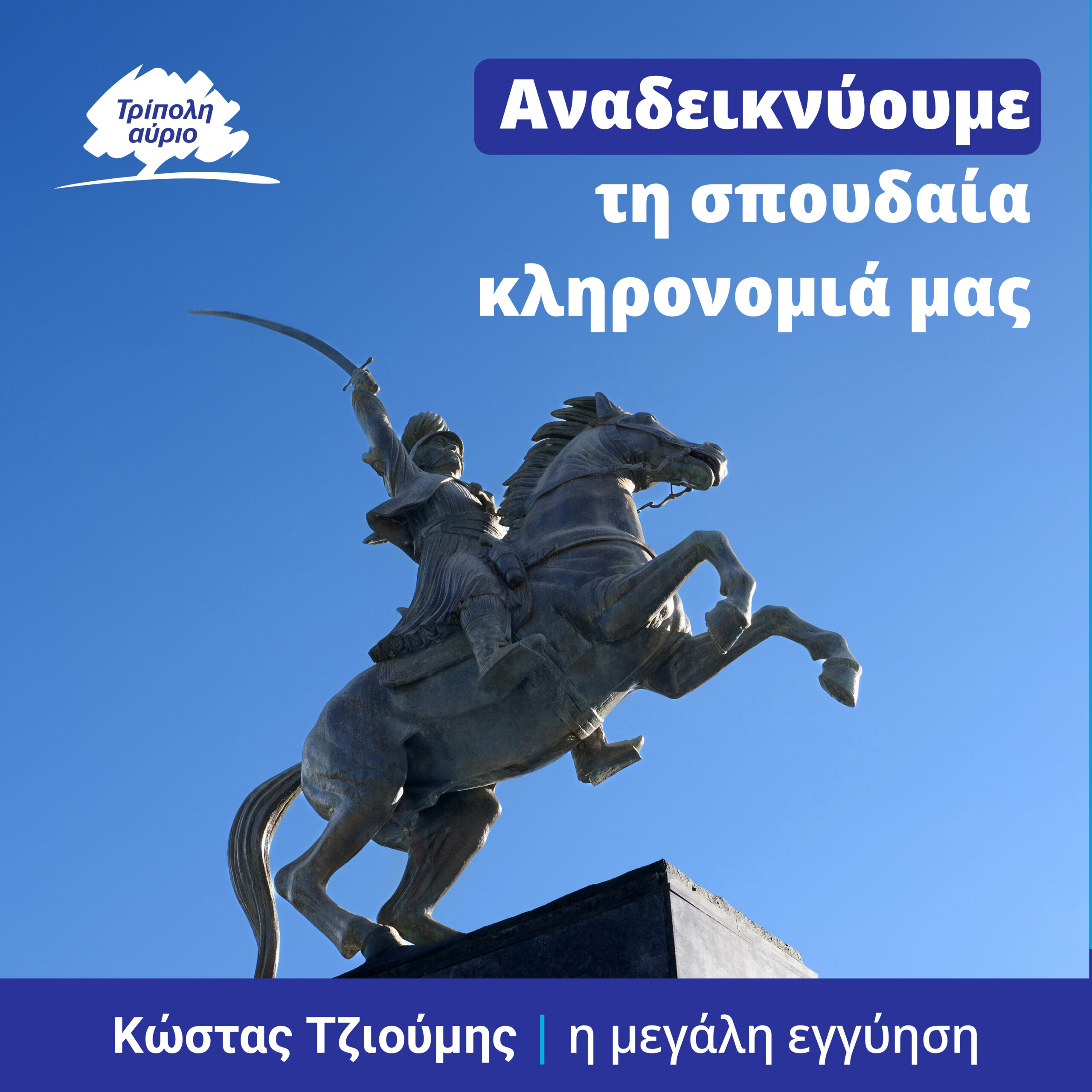 «Η πλούσια πολιτιστική μας κληρονομιά πρέπει να λάμψει» δηλώνει ο εκ νέου υποψήφιος δήμαρχος Τρίπολης και επικεφαλής του συνδυασμού «Τρίπολη Αύριο», Κώστας Τζιούμης.