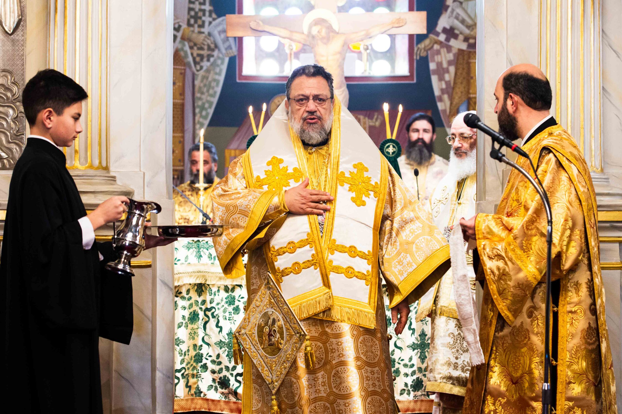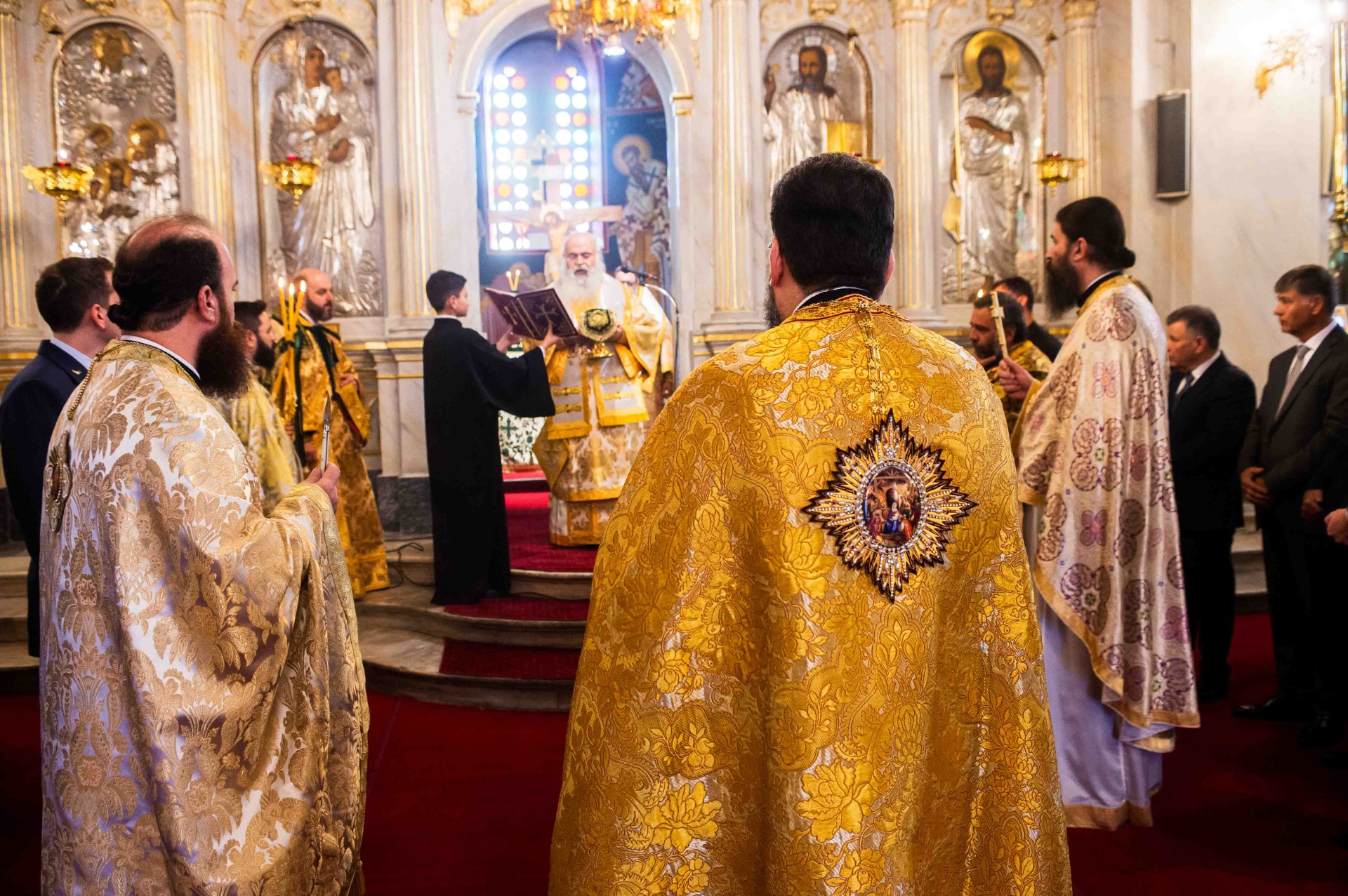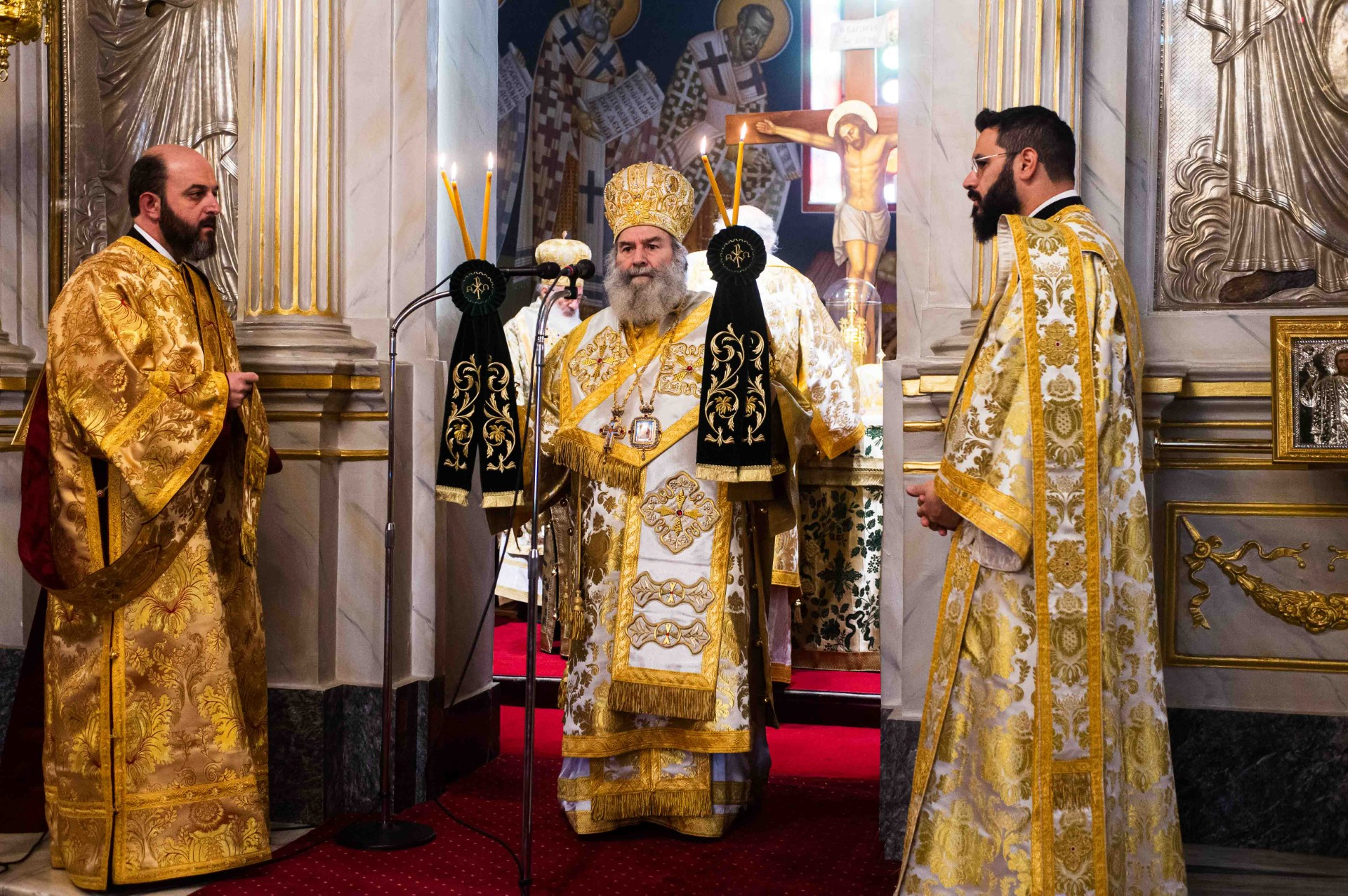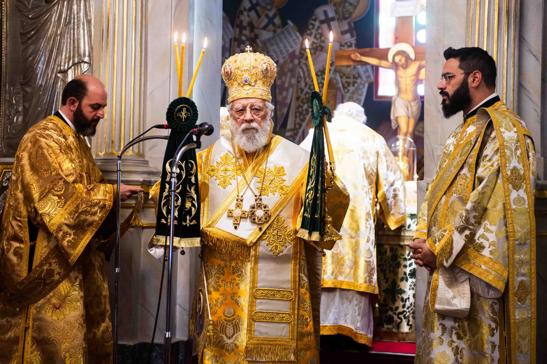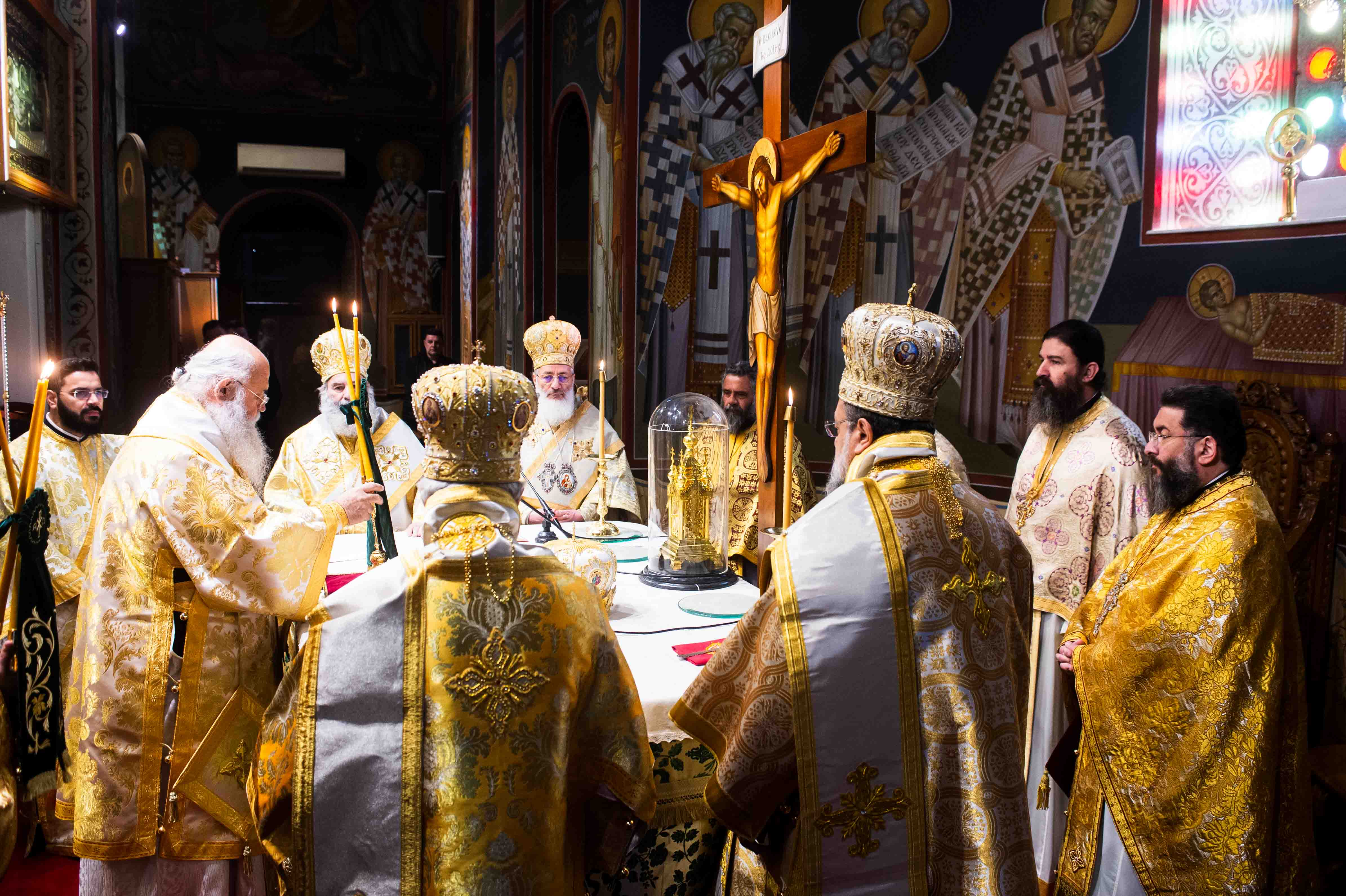 Νωρίς το πρωί τελέσθηκε η ακολουθία του Όρθρου, χοροστατούντος του Μακαριωτάτου και εν συνεχεία ακολούθησε το πολυαρχιερατικό συλλείτουργο προεξάρχοντος του Μακαριωτάτου και συλλειτουργούντων του Πανιερωτάτου Μητροπολίτου Κωνσταντίας και Αμμοχώστου κ. Βασιλείου, του Σεβ. Μητροπολίτου Μάνης κ. Χρυσοστόμου, του Θεοφιλεστάτου Επισκόπου Καρπασίας κ. Χριστοφόρου και του οικείου ποιμενάρχου Σεβ. Μητροπολίτου Μεσσηνίας κ. Χρυσοστόμου. Τους αρχιερείς πλαισίωσαν ο Πρωτοσύγκελλος της Ιεράς Μητροπόλεως Μεσσηνίας Αρχιμ. Φίλιππος Χαμαργιάς, ο εκ της Ιεράς Μητροπόλεως Κωνσταντίας και Αμμοχώστου π. Ηρακλείδιος Ξιούρος, οι εφημέριοι του ναού π. Κρεσφόντης Πουλόπουλος και π. Σωτήριος Τζαϊλέας και οι Διάκονοι Μιχαήλ Νικολάου και Θεόφιλος Κυριάκος, ενώ παρέστη συμπροσευχόμενος από του Ιερού Βήματος ο Σεβ. Γέρων Λεοντοπόλεως κ. Γαβριήλ. Προ του πέρατος της Θείας Λειτουργίας ο Σεβασμιώτατος Μητροπολίτης Μεσσηνίας κ. Χρυσόστομος ευχαρίστησε τον Μακαριώτατο και την τίμια συνοδεία του για την πολυήμερη επίσκεψη τους και την συμμετοχή τους στο συνέδριο που πραγματοποιήθηκε από την Ιερά Μητρόπολη Μεσσηνίας.