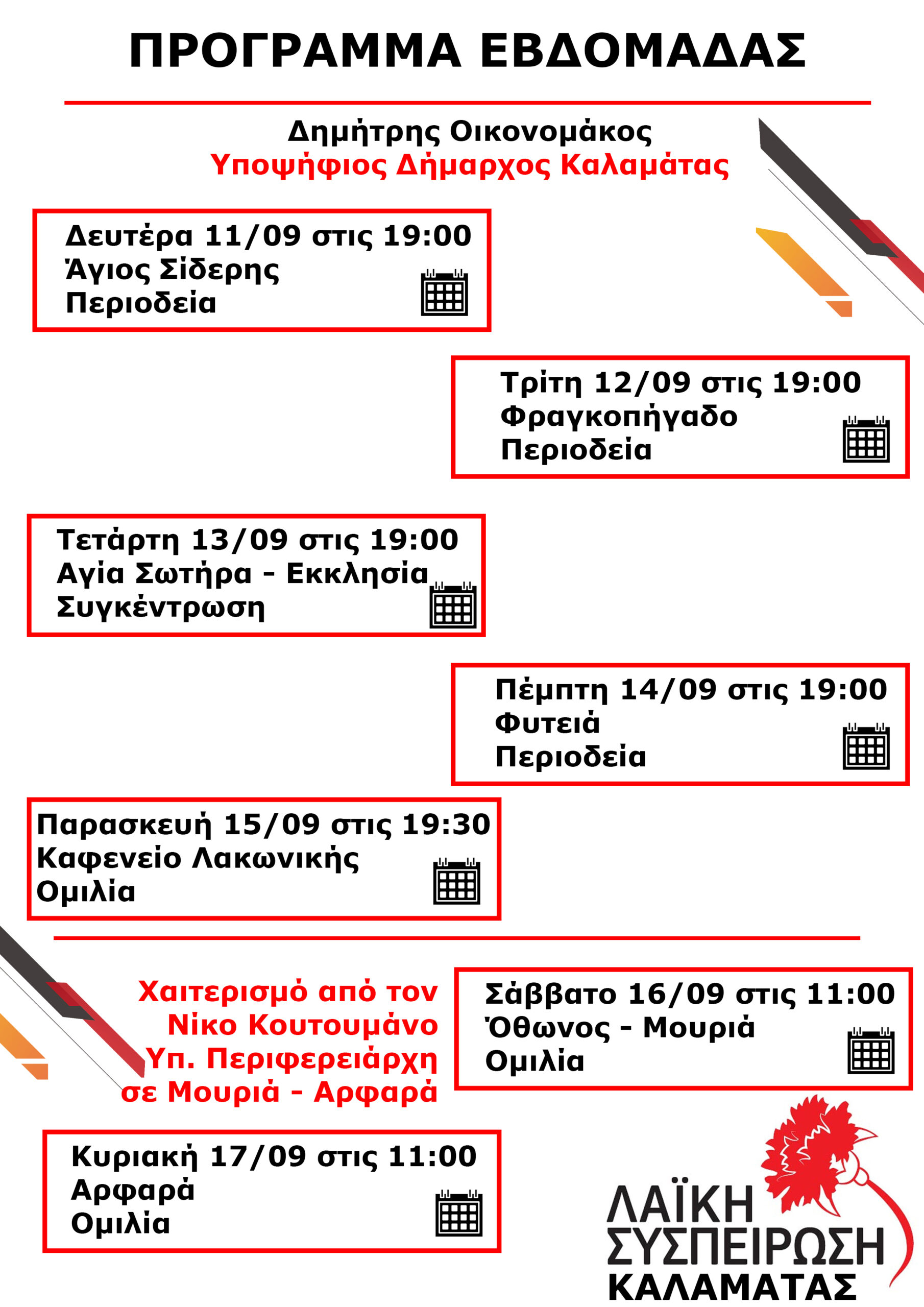 Από σήμερα Δευτέρα, μέχρι και την Κυριακή 17 Σεπτεμβρίου ο υποψήδιος δήμαρχος με την Λαϊκή Συσπείρωση πρόκειται να περιοδεύσει σε αρκετές περιοχές του δήμου. Σύμφωνα με το πρόγραμμα θα βρεθεί: