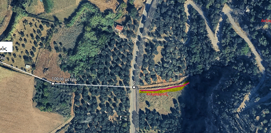 - η εκβάθυνση και διευθέτηση του υπάρχοντος χειμάρρου ανάντη του δρόμου με πρανή και βάση από σκυρόδεμα,