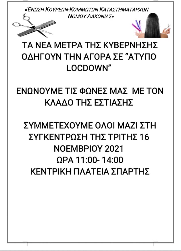 Με τα λουκέτα και την απώλεια θέσεων εργασίας να βρίσκονται προ των πυλών, και την εστίαση “ψυχοραγγεί” οι κομμωτές της Λακωνίας ενώνουν τις δυνάμεις τους στον κοινό αγώνα επιβίωσης με την εστίαση.