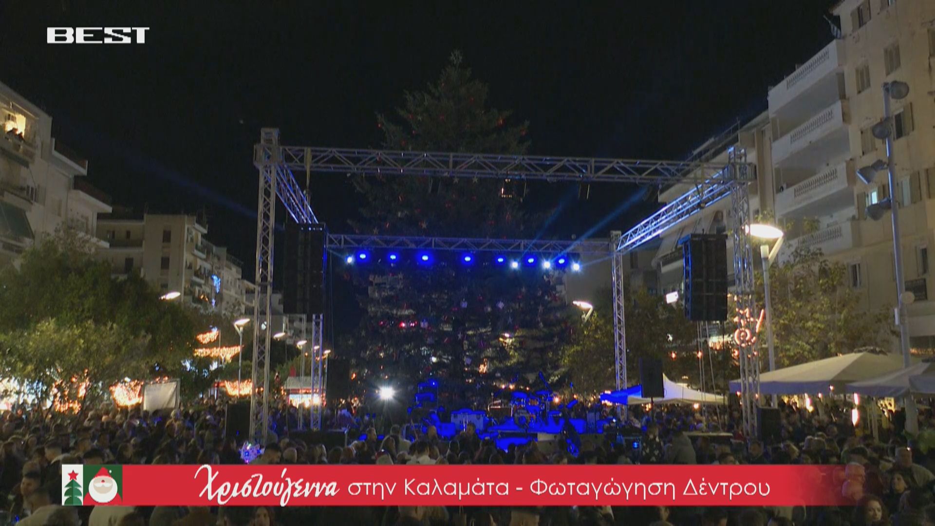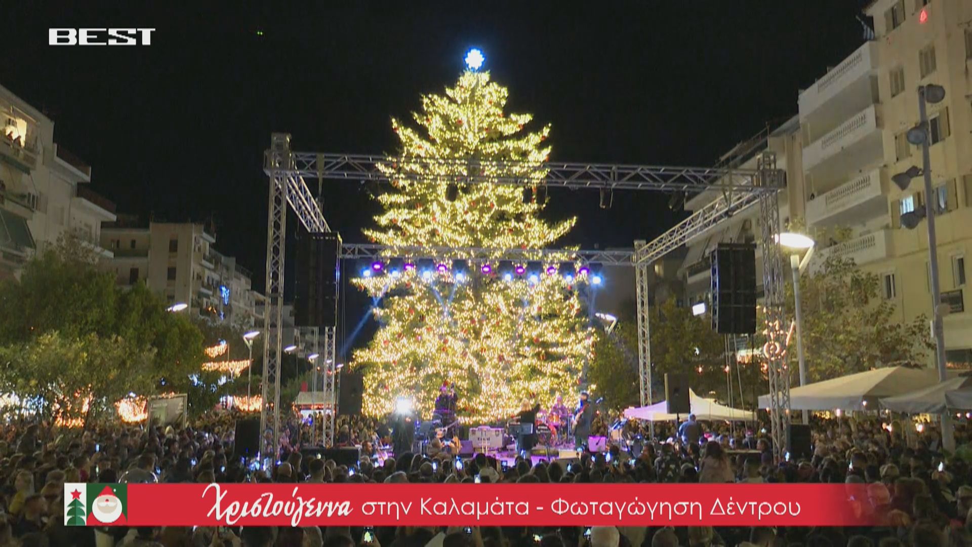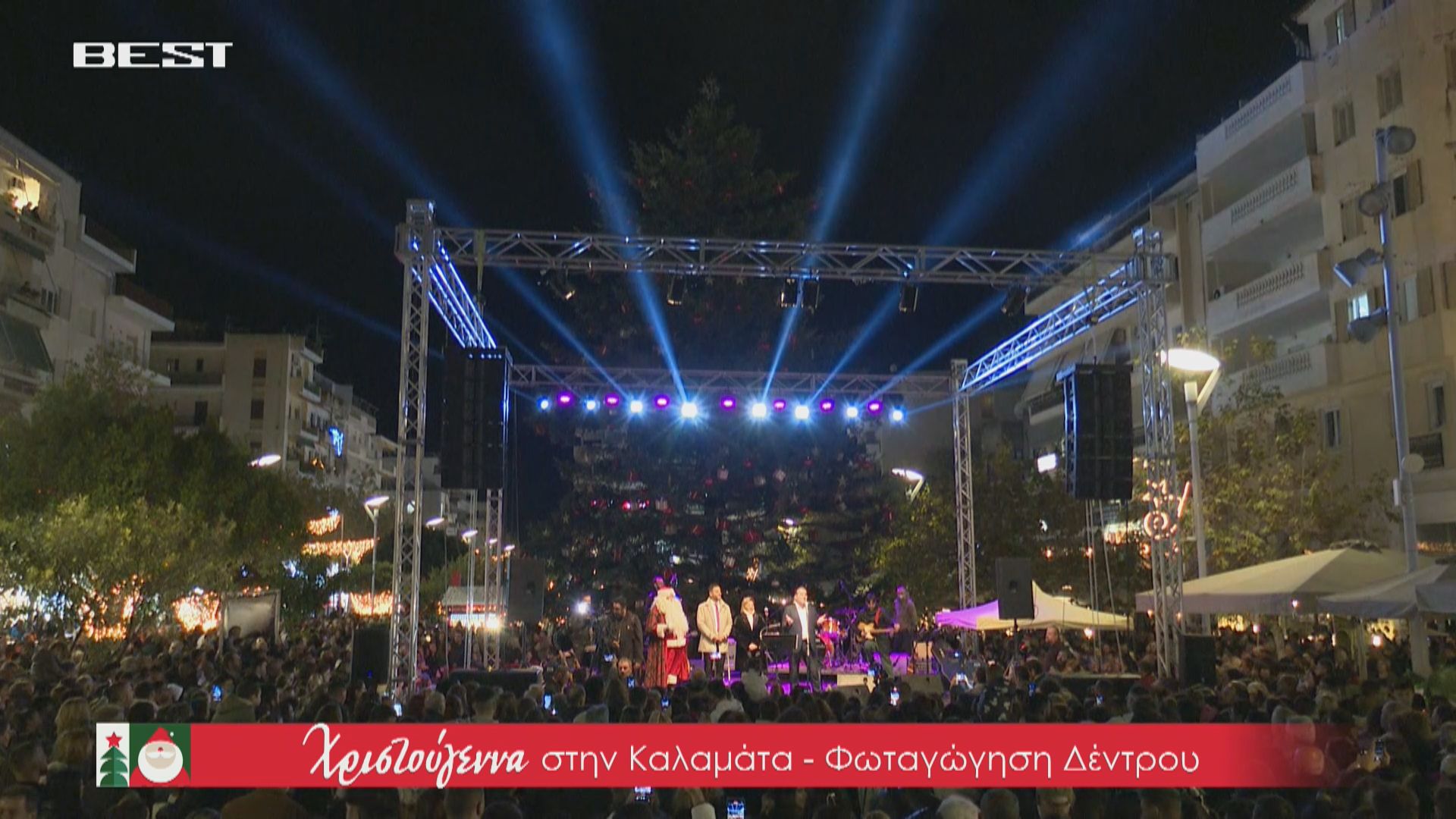 Φωταγωγήθηκε το 15μετρο φυσικό έλατο στην Κεντρική Πλατεία Καλαμάτας,παρουσία χιλιάδων μικρών και μεγάλων που βρέθηκαν στην κεντρική πλατεία της πόλης για να ανταλλάξουν ευχές και να συμμετέχουν στις εκδηλώσεις.