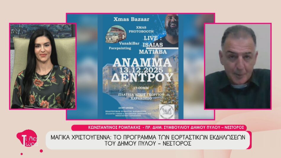 Ο Πρόεδρος του Δημοτικού Συμβουλίου Πύλου-Νέστορος, κ. Κωνσταντίνος Ρομπάκης, ήταν καλεσμένος στην εκπομπή “Τι Λες Τώρα” με την Αναστασία Μάντζαρη, όπου παρουσίασε το πλούσιο πρόγραμμα των εορταστικών εκδηλώσεων του Δήμου. Ο κ. Ρομπάκης αναφέρθηκε στις πολλαπλές δράσεις που θα λάβουν χώρα σε όλο τον Δήμο, με στόχο τη δημιουργία ενός όμορφου κλίματος αγάπης και αισιοδοξίας. Τόνισε τη σημασία της συμμετοχής των τοπικών φορέων και συλλόγων, υπογραμμίζοντας ότι ο Δήμος είναι έτοιμος να υποδεχτεί τη γιορτινή περίοδο με τον καλύτερο τρόπο.