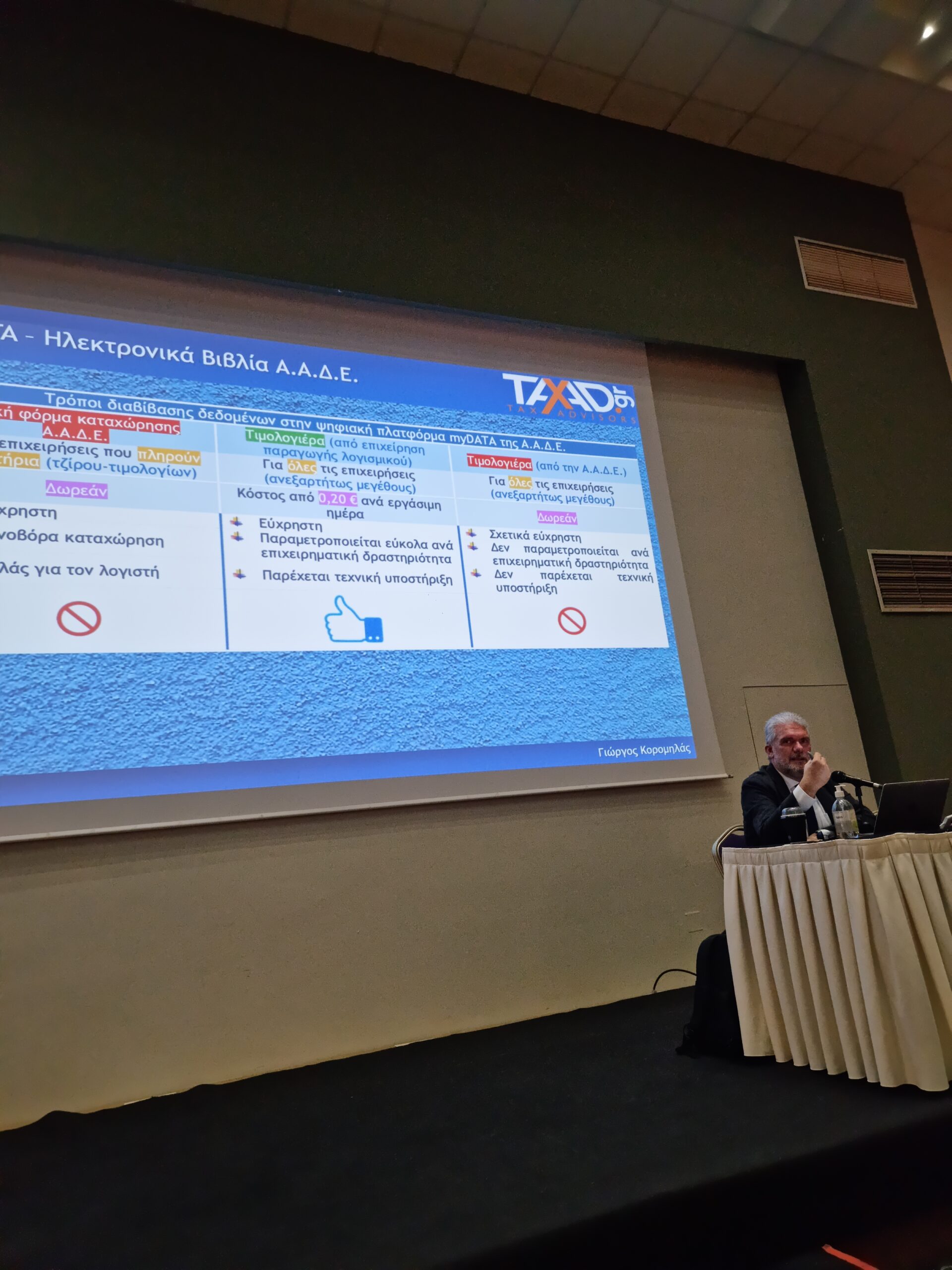 Η υποχρεωτική εφαρμογή από 01/10/2021 της τήρησης των ηλεκτρονικών βιβλίων-MyData, αποτελεί έναν στόχο του Υπουργείου Οικονομικών και της Ανεξάρτητης Αρχής Δημοσίων Εσόδων(Α.Α.Δ.Ε.). ‘Ένα στόχο που πρόκειται να αλλάξει κατά πολύ το τρόπο λειτουργίας τόσο των λογιστηρίων όλης της χώρας καθώς και του συνόλου του επιχειρηματικού κόσμου. Στα πλαίσια αυτά, η Ε.Λ.Φ.Ε.Ε. Νομού Μεσσηνίας, ανταποκρινόμενη στις ανάγκες των μελών της και τηρώντας όλα τα απαραίτητα μέτρα ασφαλείας, πραγματοποίησε με πολύ μεγάλη επιτυχία στις 25 Νοεμβρίου του 2021 το 1ο δια ζώσης σεμινάριο μετά την έναρξη της πανδημίας, με θέμα «ΗΛΕΚΤΡΟΝΙΚΑ ΒΙΒΛΙΑ Α.Α.Δ.Ε. & ΠΛΑΤΦΟΡΜΑ MyData», με εισηγητή τον Γεώργιο Κορομηλά, Φοροτεχνικό, Πρόεδρο του Ινστιτούτου Οικονομικών και Φορολογικών Μελετών (Ι.Ο.Φο.Μ.)