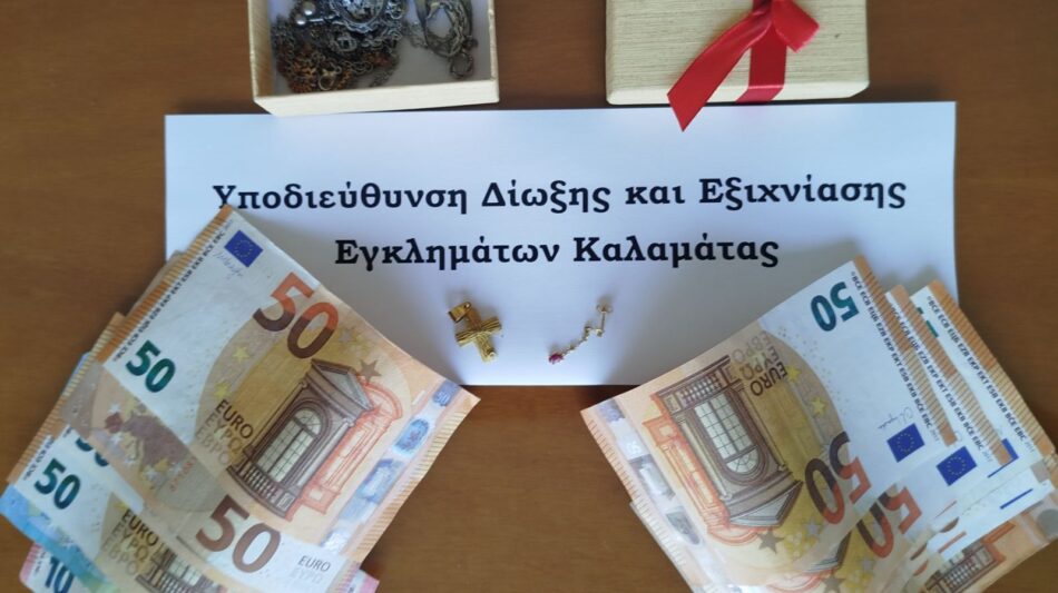 Συνελήφθη, προχθές (11.9.2025) το βράδυ, στον Ισθμό, από αστυνομικούς του Τμήματος Δίωξης και Εξιχνίασης Εγκλημάτων Κορίνθου, σε συνεργασία με αστυνομικούς της Υποδιεύθυνσης Δίωξης και Εξιχνίασης Εγκλημάτων Καλαμάτας, 41χρονος αλλοδαπός, γιατί όπως προέκυψε, λίγο νωρίτερα αφαίρεσε από οικία ημεδαπού, στην Καλαμάτα, χρήματα και κοσμήματα. Στην κατοχή του, βρέθηκε χρηματικό ποσό, το οποίο αποδόθηκε στον παθόντα. Επιπλέον, για την ίδια υπόθεση, συνελήφθησαν, 35χρονη ημεδαπή και 67χρονος ημεδαπός, αντίστοιχα, για αποδοχή και διάθεση προϊόντων εγκλήματος, καθώς ανωτέρω κλαπέντα κοσμήματα, βρέθηκαν σε επιχείρηση (ενεχυροδανειστήριο) που διατηρούν, τα οποία κατασχέθηκαν και αποδόθηκαν. Προανάκριση διενεργεί η Υποδιεύθυνση Δίωξης και Εξιχνίασης Εγκλημάτων Καλαμάτας.
