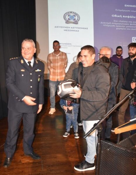 Τέλος, μετά τις εισηγήσεις, ακολούθησε η κλήρωση -20- κρανών στους συμμετέχοντες (-10- για μοτοσικλέτες και -10- για ηλεκτρικά πατίνια), τα οποία ήταν μία ευγενική χορηγία του Δικηγορικού Συλλόγου Καλαμάτας.