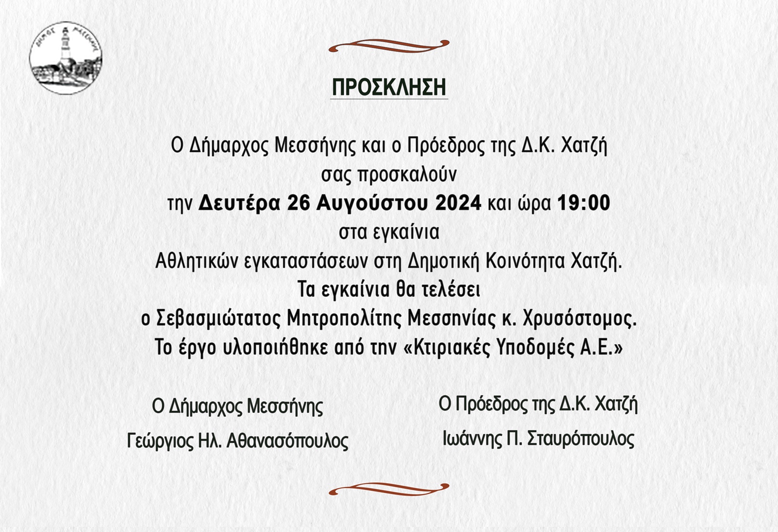 Οι αθλητικές εγκαταστάσεις στη Δημοτική Κοινότητα Χατζή εγκαινιάζονται την Δευτέρα, 26 Αυγούστου 2024 στις 7 μ.μ. και τα εγκαίνια θα τελέσει ο Σεβασμιώτατος Μητροπολίτης Μεσσηνίας κ. Χρυσόστομος.