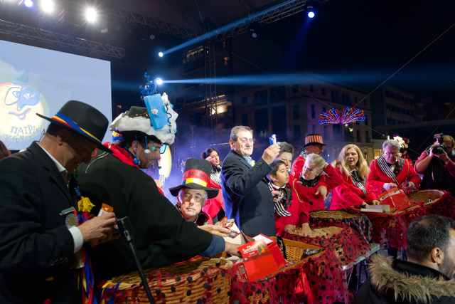 Λίγο πριν ο Πρόεδρος της ΚΕΔΗΠ-Καρναβάλι Πάτρας Παύλος Σκούρας καλωσορίζοντας το πλήθος είπε: «Καλώς ανταμώσαμε στην Τελετή Έναρξης της μεγάλης γιορτής της Πάτρας. Το Καρναβάλι της Πάτρας, το Καρναβάλι της Ελλάδας, το Καρναβάλι της Ελπίδας χτίζεται ολοχρονίς από τον Δήμο της Πάτρας, τους εργαζόμενους και τον πατρινό λαό». Και ευθύς κάλεσε τον Δήμαρχο Πατρέων και τους καρναβαλικούς του «φρουρούς» Κωνσταντίνο Δραγώτη και Δημήτρη Δημησιάνο στην κεντρική σκηνή της πλατείας.