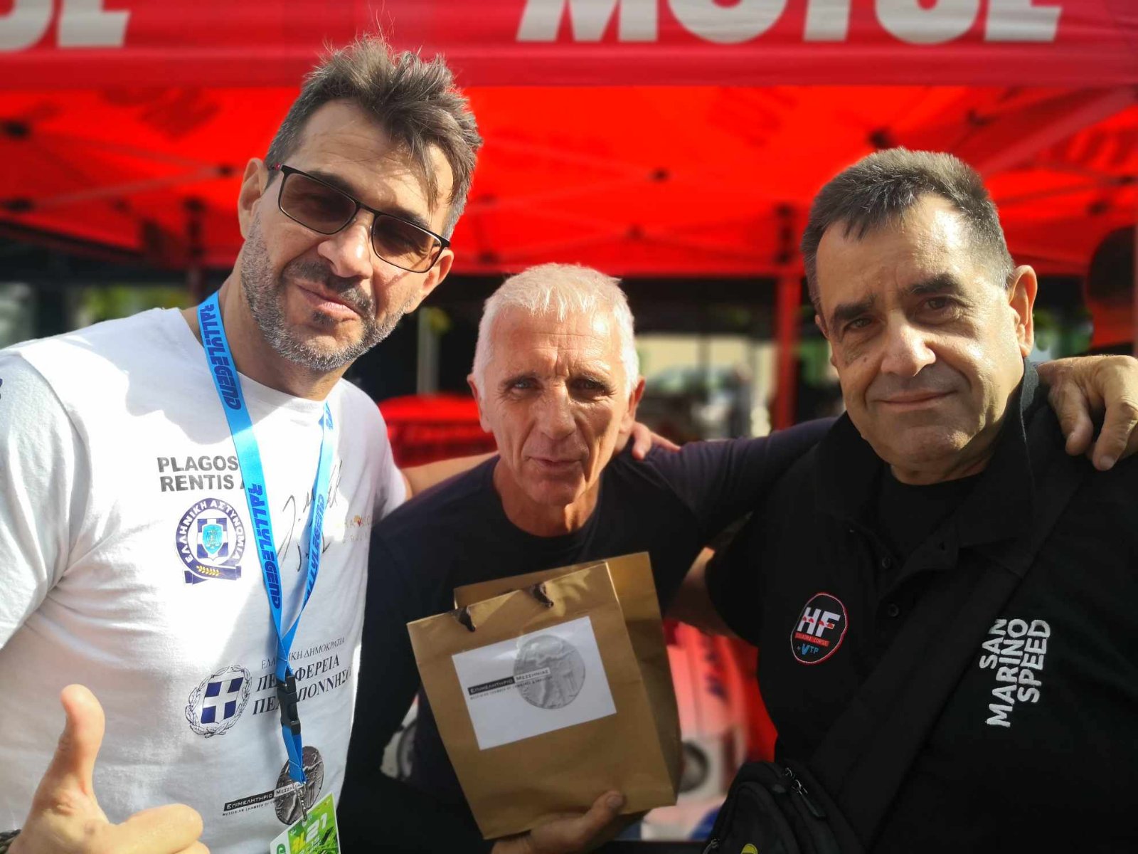 Ο Γιάννης Πλάγος στο πλευρό του Micki Biasion (με το ριγέ), του δις παγκόσμιου πρωταθλητή και θρύλου των αγώνων αυτοκινήτου, και του Piarulli Vito (με το καπέλο) διοργανωτή του Rally Legend. Ο τελευταίος δήλωσε ενθουσιασμένος με την πρωτότυπη κίνηση του επιμελητηρίου Μεσσηνίας να προσφέρει δώρα με άρωμα και γεύση από Μεσσηνία! Μαζί τους ο μάνατζερ Στέλιος Φάκαλης.