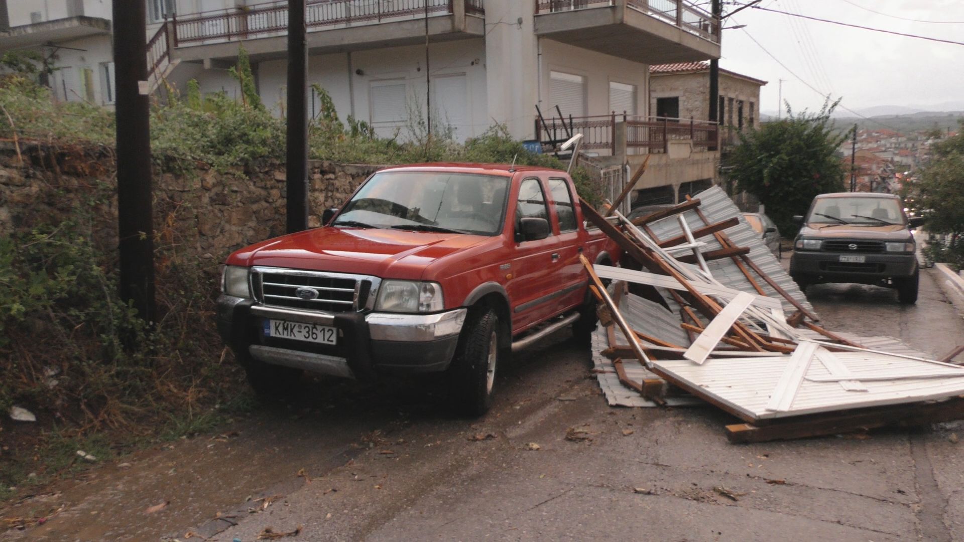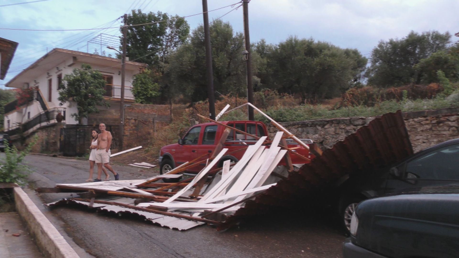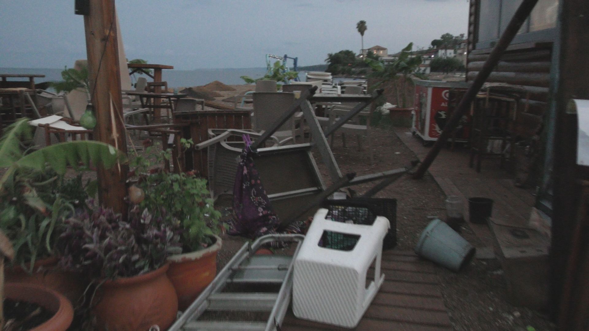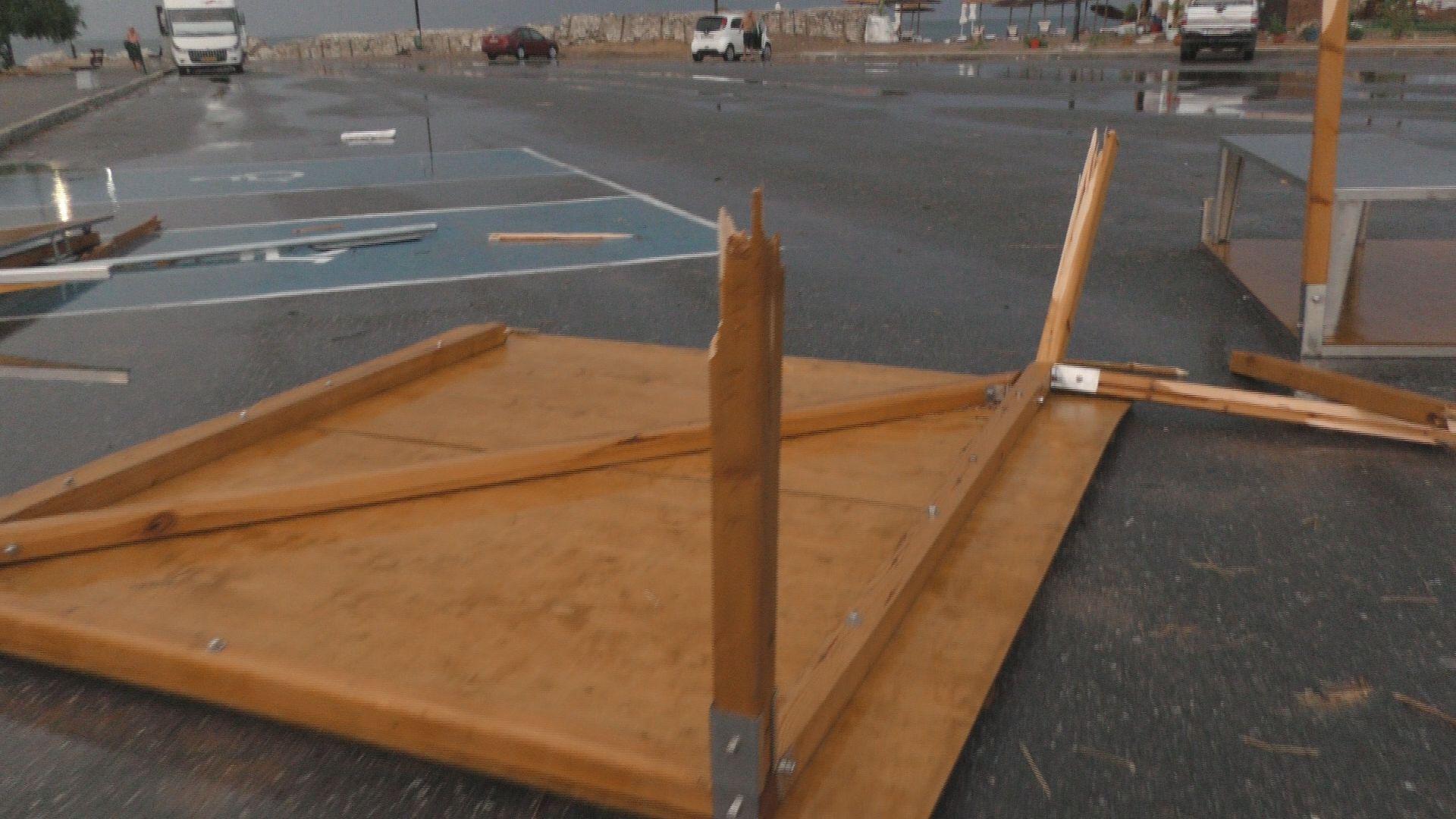 Ο ισχυρός άνεμος ξήλωσε δένδρα, ξεκόλλησε λαμαρίνες από σπίτια και δημόσιες τουαλέτες ΑμεΑ ακόμα και κατασκευές από τα παραλιακά καταστήματα με ομπρέλες να παρασύρονται από την αμμουδιά μέχρι την πλατεία του χωριού