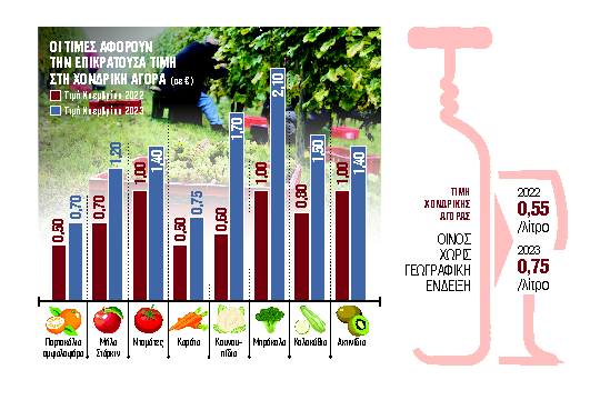Ωστόσο, όπως εξηγεί ο ίδιος, η σταφυλική παραγωγή εξαγοράστηκε περίπου 5%-15% παραπάνω σε σχέση με τις περσινές τιμές, γεγονός που δεν δικαιολογεί την αύξηση που συναντά κανείς στην τιμή του κρασιού. «Βλέπουμε μια αύξηση κατά 36,5% στους οίνους χωρίς γεωγραφική ένδειξη και κατά 40% στους οίνους με γεωγραφική ένδειξη. Είναι μια αύξηση κατά 10%-15% που δεν δικαιολογείται από εκείνη των τιμών της πρωτογενούς παραγωγής. Πέρυσι η τιμή του οίνου χωρίς γεωγραφική ένδειξη ήταν στα 0,55 ευρώ το λίτρο, ενώ τώρα έχει φτάσει στα 0,75 ευρώ το λίτρο».