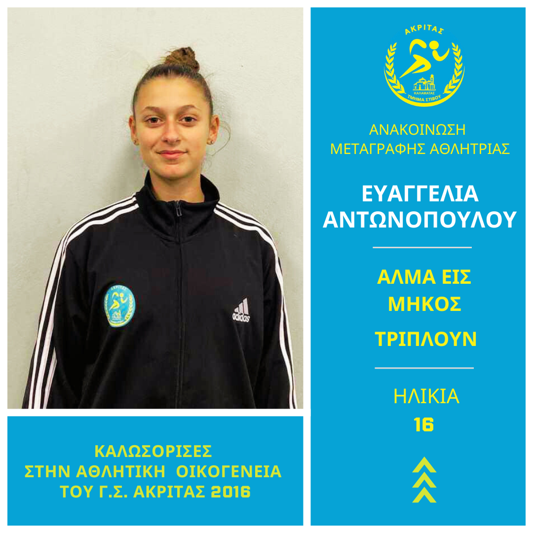 Ο ΓΣ Ακρίτας 2016 συνεχίζει να δυναμώνει, εντάσσοντας νέα παιδιά, φερέλπιδες αθλητές και αθλήτριες στο έμψυχο δυναμικό του. Η νέα μεταγραφή του συλλόγου ακούει στο όνομα Ευαγγελία Αντωνοπούλου. Αθλήτριας μήκους και τριπλούν που ενσωματώνεται στην καλαματιανή ομάδα που συνεχώς μεγαλώνει.