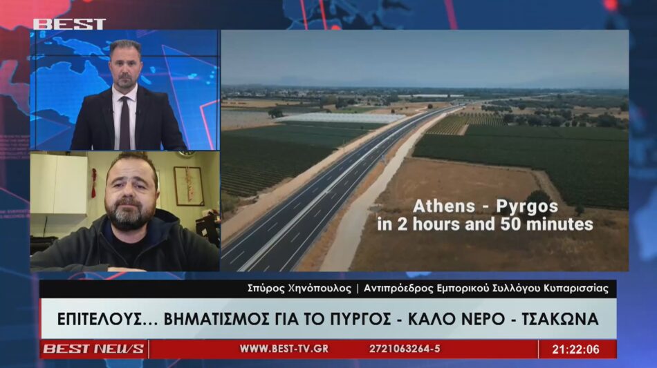 Ως μια ουσιαστική κίνηση που δρομολογεί τις εξελίξεις για την υλοποίηση του πολυαναμενόμενου οδικού άξονα χαρακτήρισε την πρωτοβουλία της Ολυμπίας Οδού ο αντιπρόεδρος του Εμπορικού Συλλόγου Κυπαρισσίας. Ο Σπύρος Χηνόπουλος μιλώντας στο κεντρικό δελτίο ειδήσεων του best τόνισε μεταξύ άλλων ότι πρόκειται «Για εμάς είναι ένα ελπιδοφόρο μήνυμα. Δεν ενθουσιαζόμαστε ότι σίγουρα θα προχωρήσουμε στην υλοποίηση του δρόμου αλλά μας κάνει αισιόδοξους ώστε να συνεχίσουμε να παλεύουμε για την υλοποίηση του συγκεκριμένου οδικού άξονα». Υπογραμμίζοντας στη συνέχεια ότι ζητούμενο για την περιοχή είναι «ένας ασφαλής αυτοκινητόδρομος και να έχει σε κάθε ρεύμα τουλάχιστον δυο λωρίδες κυκλοφορίας» καλώντας επί τη ευκαιρία τους τοπικούς πολιτικούς άρχοντες «να προσπαθήσουν όσο μπορούν περισσότερο ώστε να προωθηθεί αυτό το έργο»συμβάλλοντας στην επιτάχυνση των γραφειοκρατικών διαδικασιών ώστε, όπως είπε «κάποια στιγμή, η δικιά μας η γενιά να δει την υλοποίηση ενός τόσο σημαντικού έργου για όλη την Τριφυλία». Ο κ. Χηνόπουλος επισήμανε τέλος τις συνεχείς παρεμβάσεις του Εμπορικού συλλόγου που επί 5ετίας κρατά το θέμα στην επικαιρότητα.
