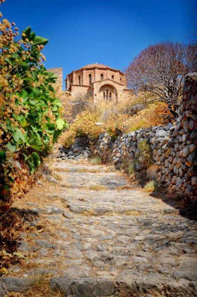 Τώρα χαλάσματα, που μας γοητεύουν και τα θαυμάζουμε, που μας προσφέρουν μια γεύση αιωνιότητας, καθώς περνάμε την πύλη της πάνω πόλης, μόλις έχουμε ανεβεί τον ανήφορο του μονοπατιού, πλάι στα μέσα τείχη με τα μεσαιωνικά παρατηρητήρια και τις μικρές πολεμίστρες, ανάμεσα στις φραγκοσυκιές και τ’ αγριολούλουδα. Ο μεσαιωνικός ορθόδοξος ναός της Αγια-Σοφιάς είναι σε καλή κατάσταση. Παρατηρούμε το θόλο και τα άλλα υπολείμματα της αρχιτεκτονικής και της λατρείας, ψάχνοντας για τους κρυμμένους θησαυρούς για τους οποίους μιλούν οι Μονεμβασίτες, κι ύστερα τρέχουμε στην κορυφή, να δούμε την τεράστια για τις αναλογίες του χώρου μπαρουταποθήκη, και στη συνέχεια τις τρεις μεγάλες δεξαμενές νερού, που στέκουν επίσης καλά, παρά τα βαθιά γεράματά τους. Αφήνουμε στο τέλος τις πιο νοσταλγικές αναζητήσεις μέσα στα ερείπια του χρόνου και της εγκατάλειψης. Κι όλο κάτι βρίσκουμε από καμάρες και ευγενικούς θόλους, για να πυροδοτήσει τη φαντασία μας και να πλάσουμε τα δικά μας παραμύθια, μαζί με τα όνειρα που απλώνονται ακόμα πιο πέρα, καθώς η θέα της θάλασσας ταξιδεύει τα μάτια μας, ή μόνο την ψυχή μας, όταν βραδιάζει ή η ατμόσφαιρα είναι θολή και μελαγχολική, ως την άκρη του κόσμου.