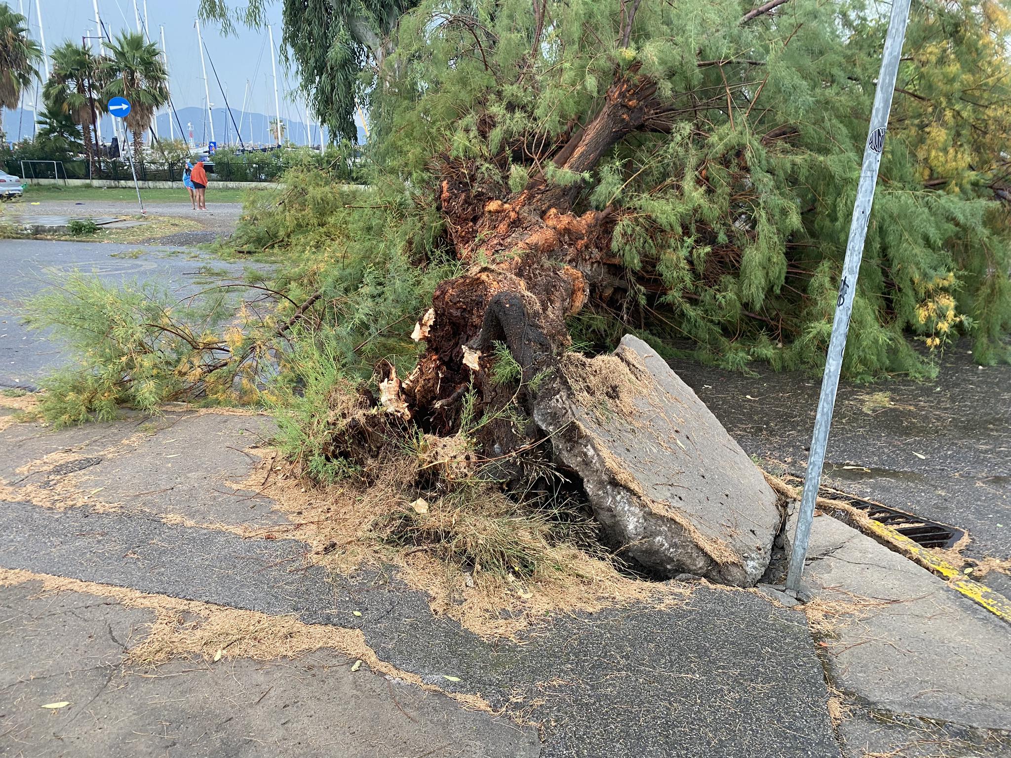 Ίδια εικόνα και στην περιοχή της Μαρίνας όπου δέντρο ξεριζώθηκε από το πεζοδρόμιο και μαρτυρά τη δύναμη των ανέμων και της έντονης βροχόπτωσης που επικράτησαν για αρκετή ώρα στην περιοχή.