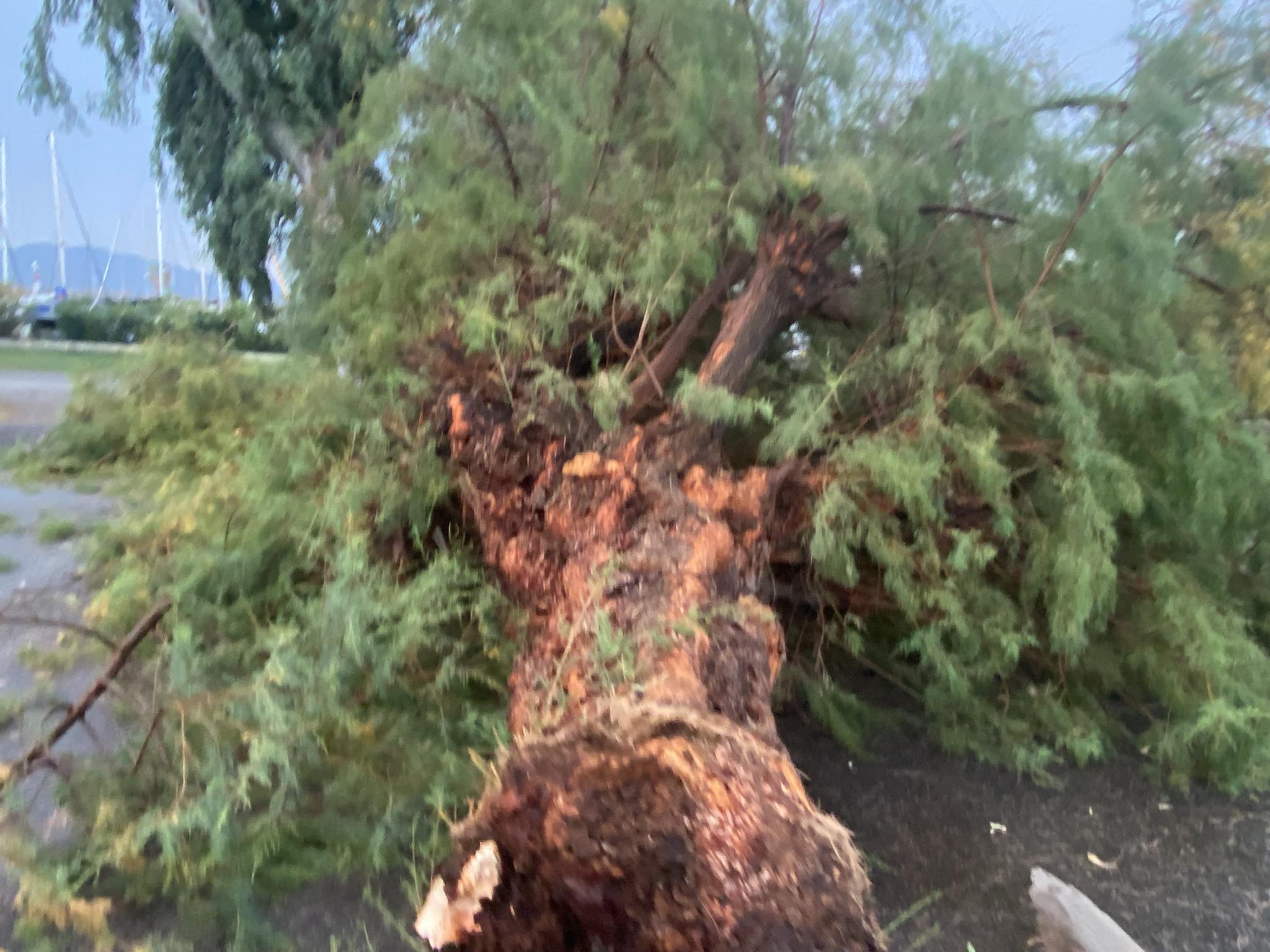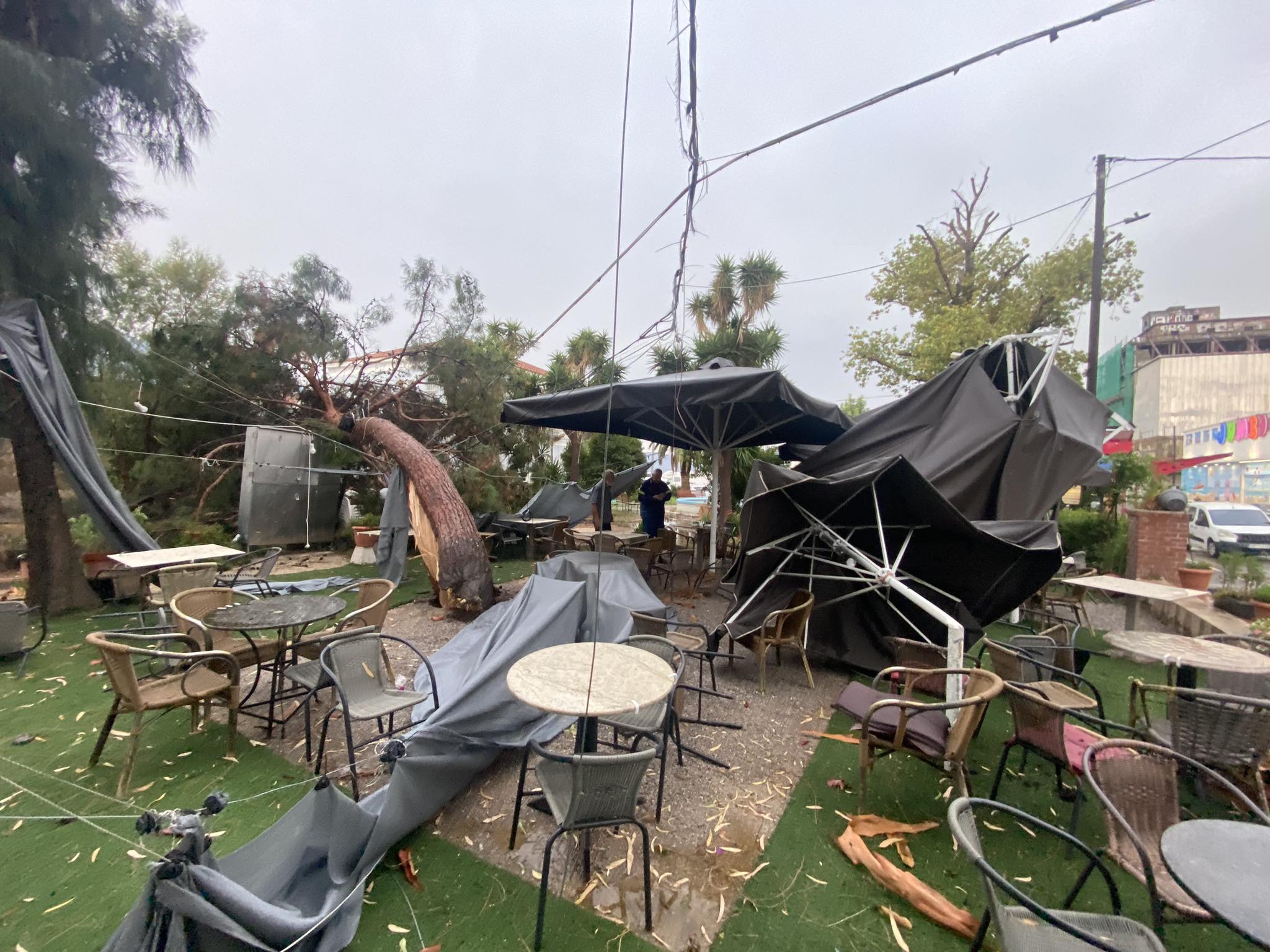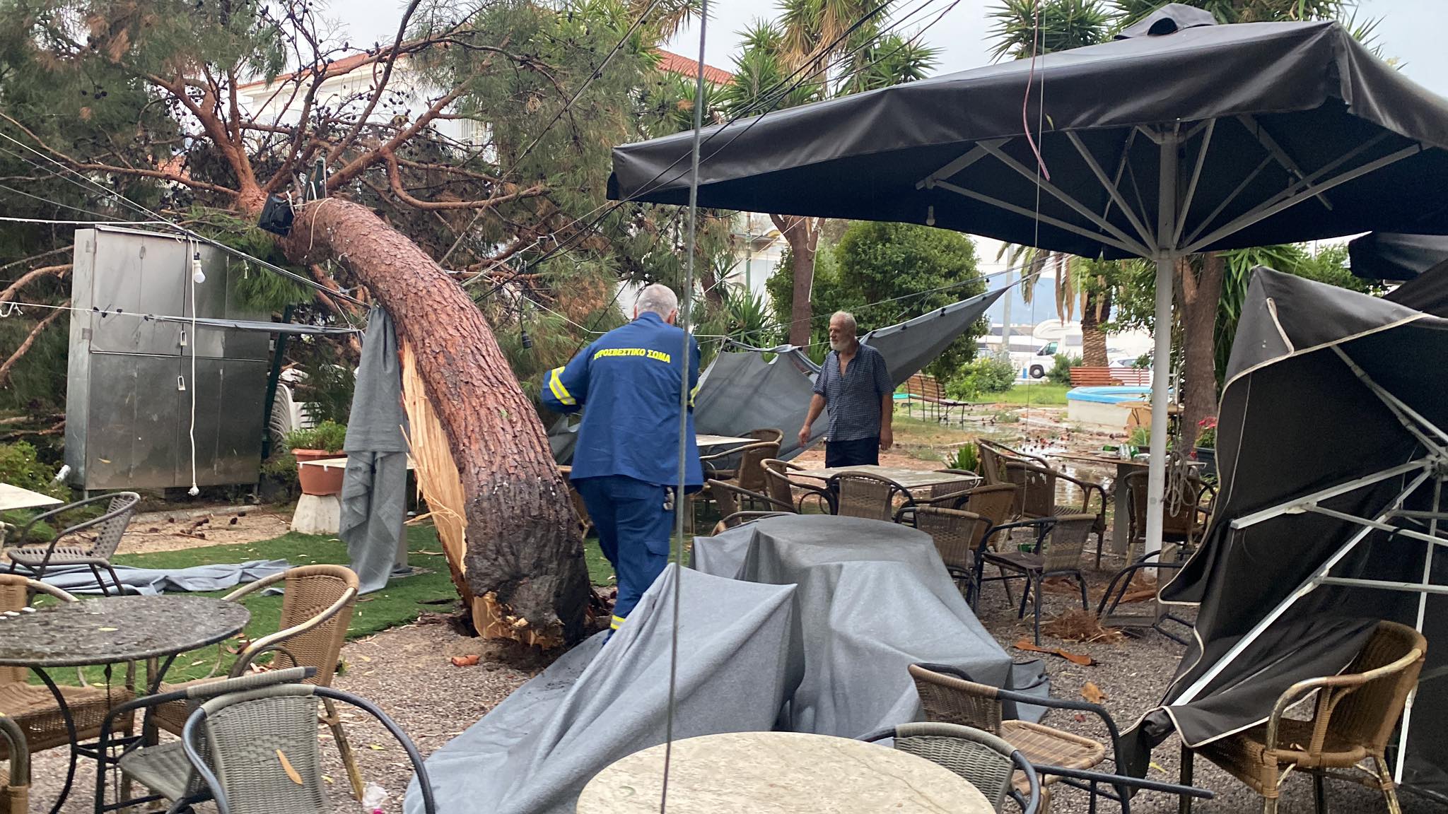 Στο πάρκο του Λιμενικού όπου δραστηριοποιούνται επιχειρήσεις εστίασης η ορμή του ανέμου έσπασε στη μέση δένδρο προκαλώντας υλικές ζημιές και ξήλωσε εξοπλισμό σκίασης.